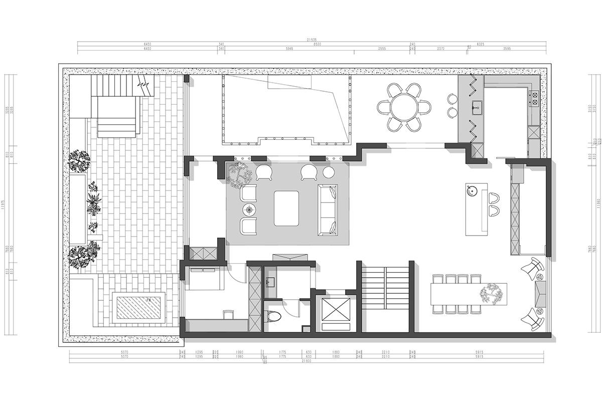 负一层以开放复合的空间形态,打造集家庭社交、休闲与餐厨功能于一体的多元生活主场。大面积客餐一体的横厅布局,将客厅、长桌区与餐厅自然串联,让家人互动与朋友聚会的场景无界延伸;西侧连通的下沉庭院,为地下空间引入自然采光与景观,打破了传统地下室的封闭感;配套的公卫与独立储物间,兼顾了使用的便利性与收纳需求。