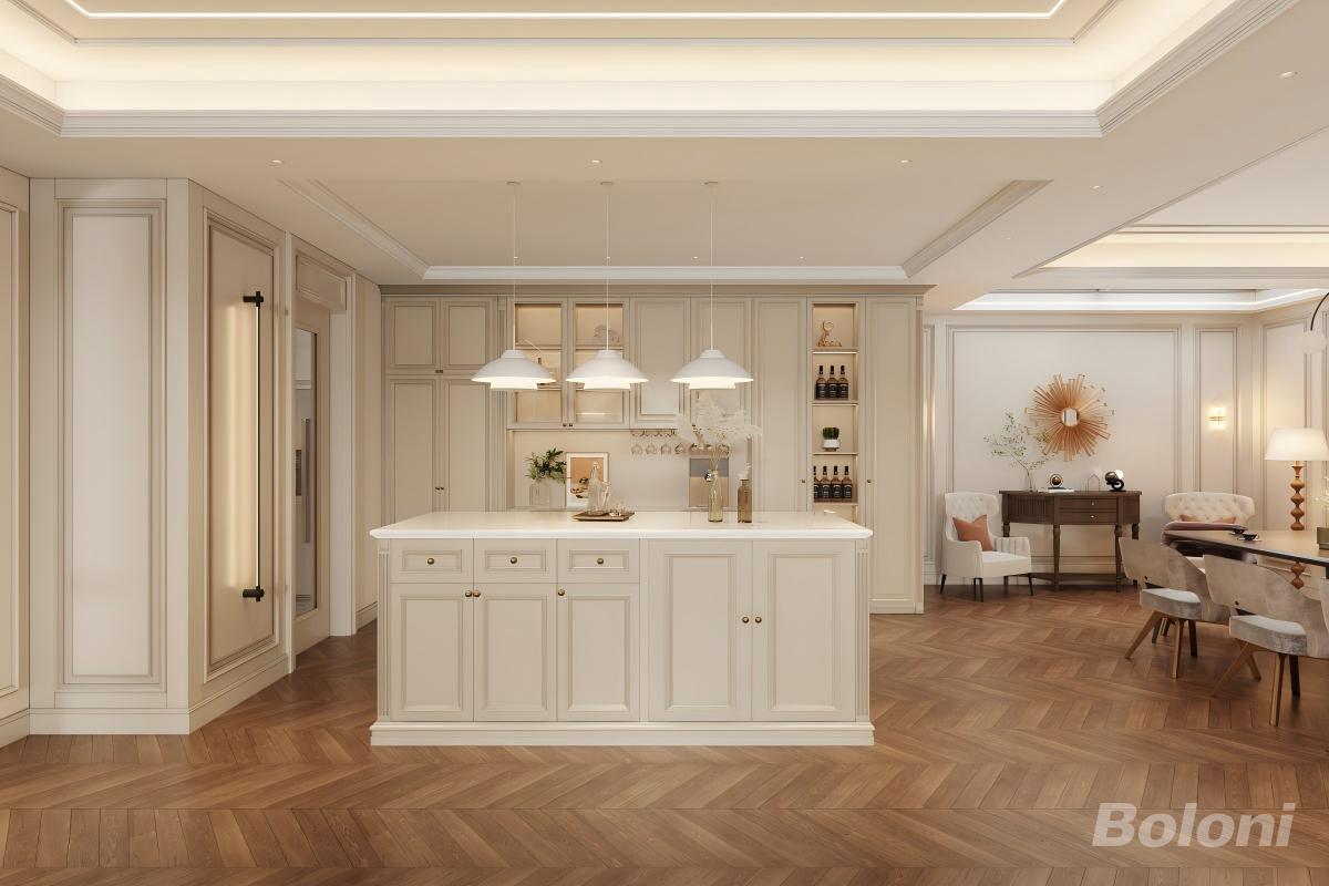 餐厅空间延续了客厅的色彩基调,统一的材质与配色让一层公区形成完整而连贯的整体。精致的凹凸造型门板赋予空间清晰的层次与优雅韵律,暖白基底上,绿色与咖色的搭配为空间注入了沉静力量,褪去浮华,回归舒适本真。