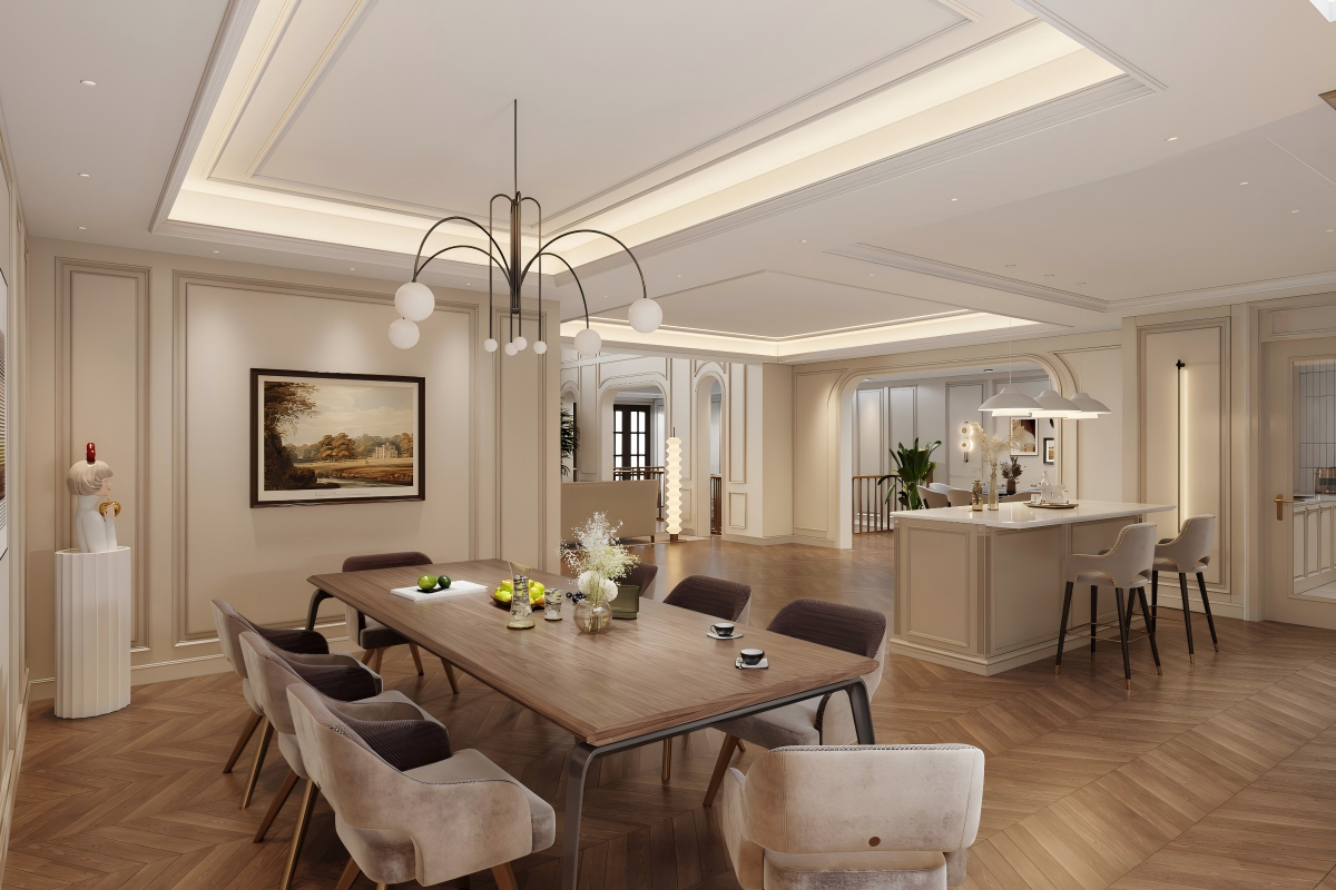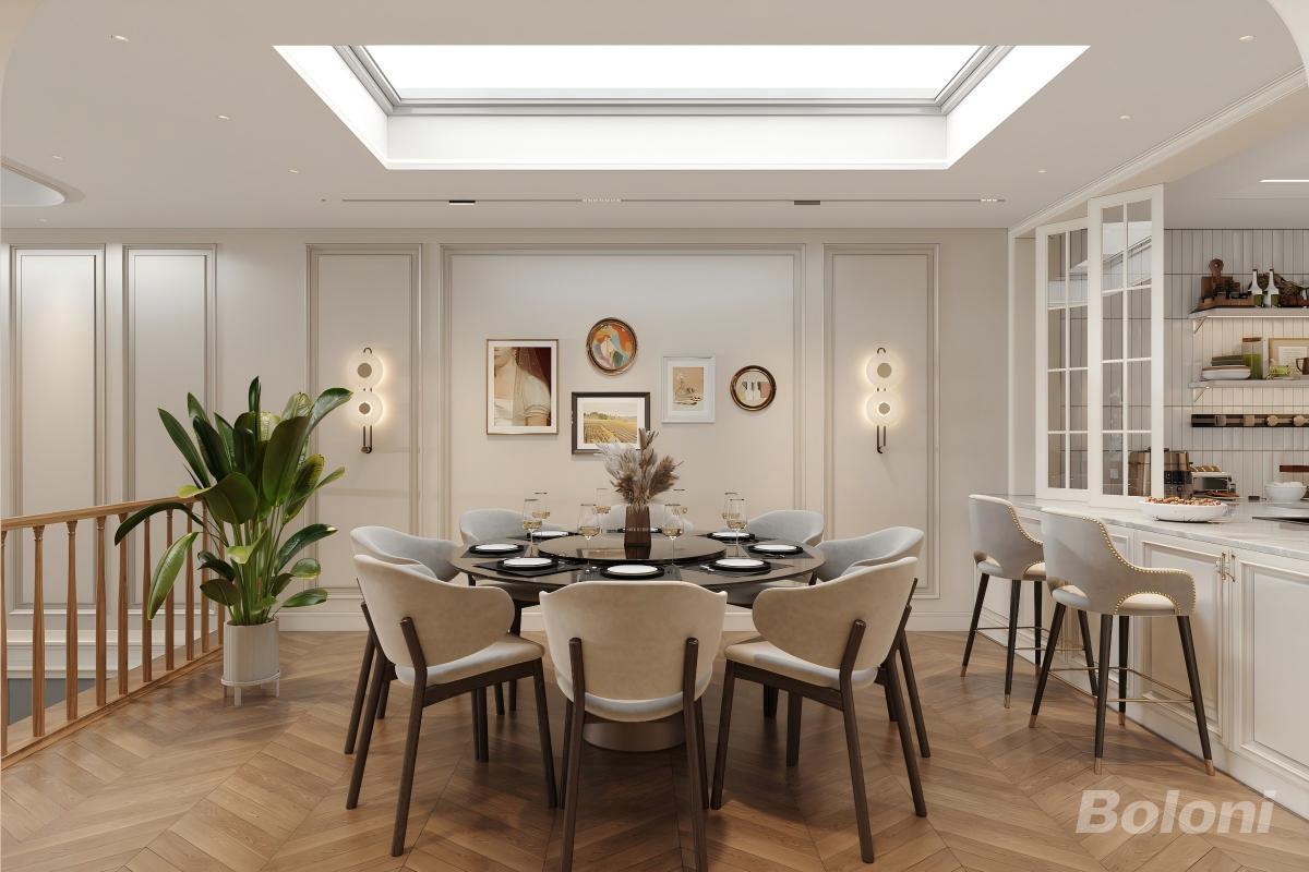 负一中餐厅温润人字拼木地板搭配奶白护墙板,勾勒出柔和优雅的底色。圆形餐桌与吧台区相邻,自然衔接了用餐与备餐场景;天窗与壁灯的光线交织,让整个空间通透而富有层次,营造出温馨舒适的用餐氛围。