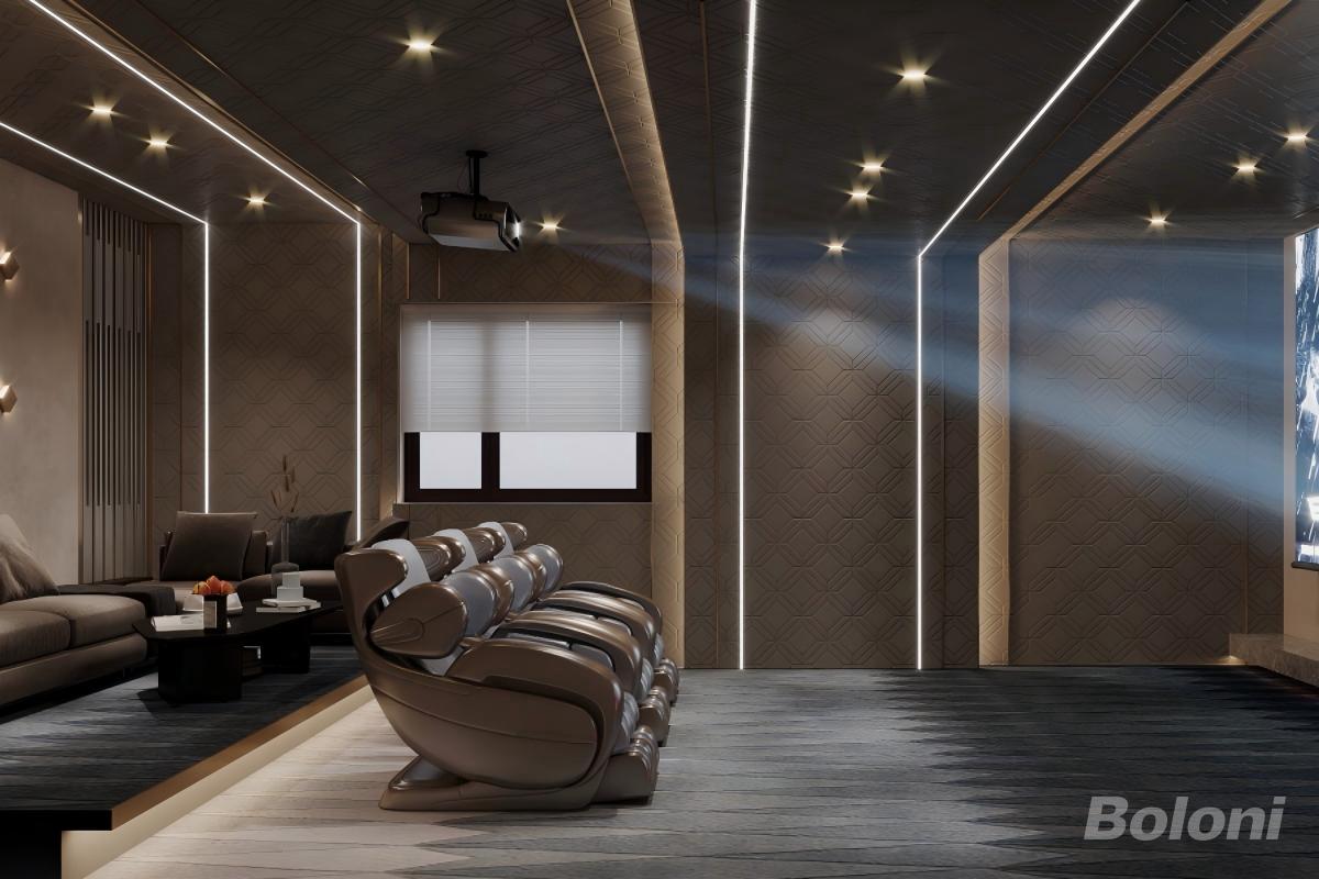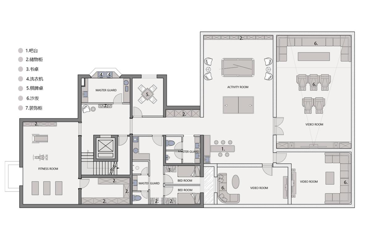 负一楼以 “家庭兴趣与社交” 为核心,打造了一处功能复合的地下生活主场。空间以公共活动区为中心,串联起多元场景:左侧规划独立健身区,满足日常运动需求;中部设置棋牌娱乐区与开放活动厅,为亲友聚会提供了轻松的互动空间;右侧双影音室的配置,可兼顾观影与家庭 KTV 等多种娱乐模式。同时,贴心规划了吧台、储物间及多组卫浴,让休闲场景也能兼顾便利与舒适。