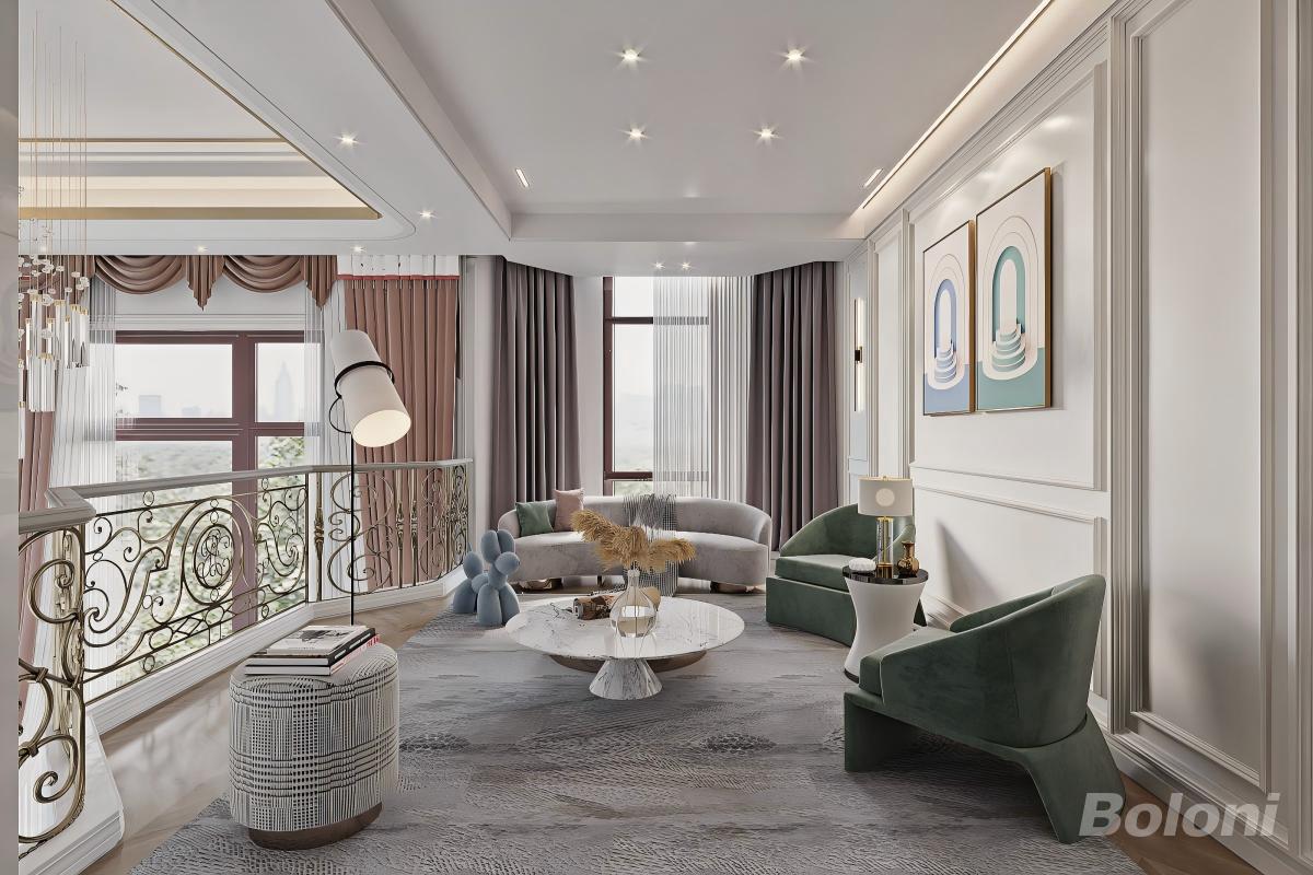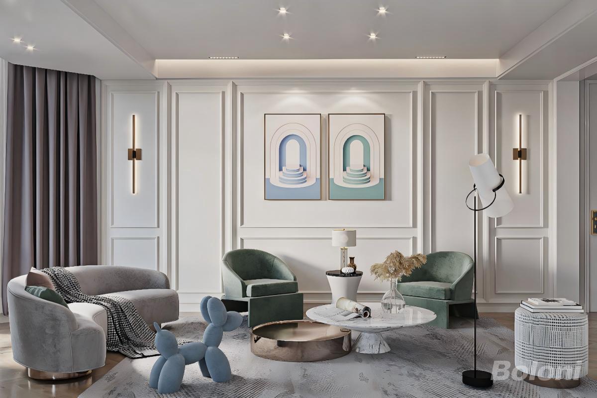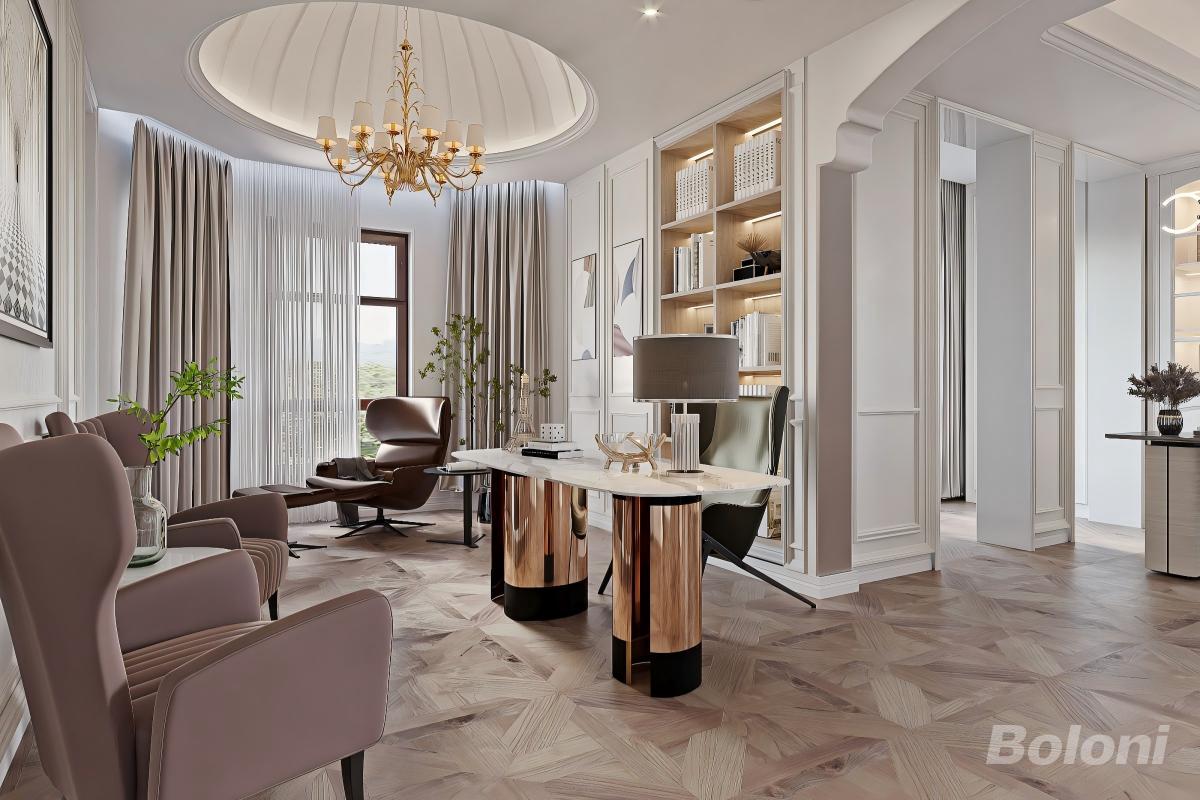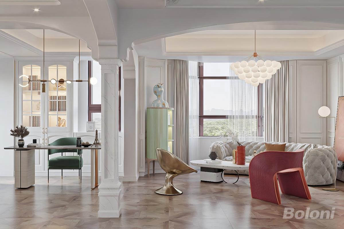 客书一体化空间,以轻美式的优雅为基底,开放式布局让书房与客厅自然相融。大理石柱与柔美的拱形线条勾勒出空间轮廓,墨绿色书椅、金色艺术单椅与红色休闲椅碰撞出鲜活的艺术张力,在温润的人字拼地板上,营造出兼具格调与松弛感的多元生活场景。