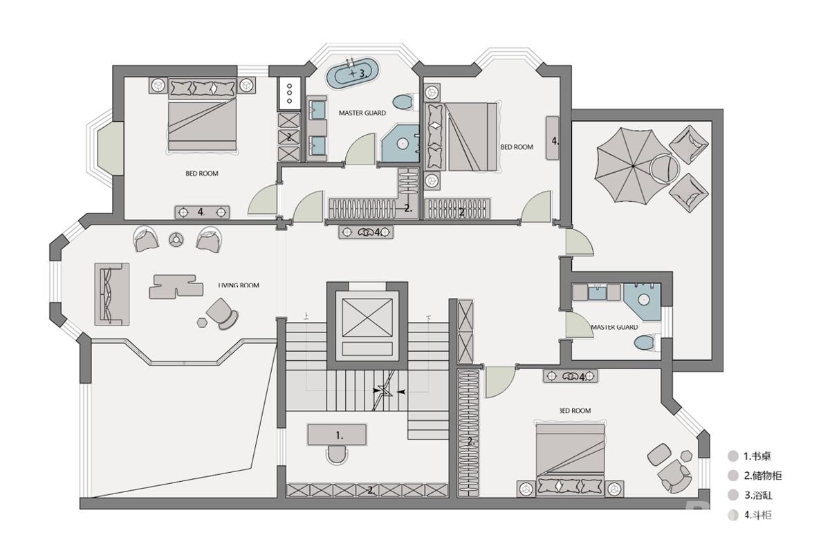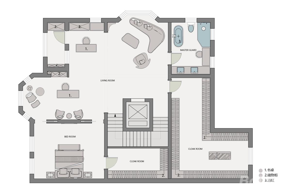 二层以纯粹的居住功能为核心,打造了一处静谧私密的家庭休息层。以中央楼梯为界,南北分布三间卧室套房,均配备独立卫浴与充足收纳,兼顾家人居住的隐私与舒适。中间的开放起居厅,成为家人互动的轻社交空间,整体动线流畅,动静分区清晰,让这里成为远离喧嚣的温馨港湾。
