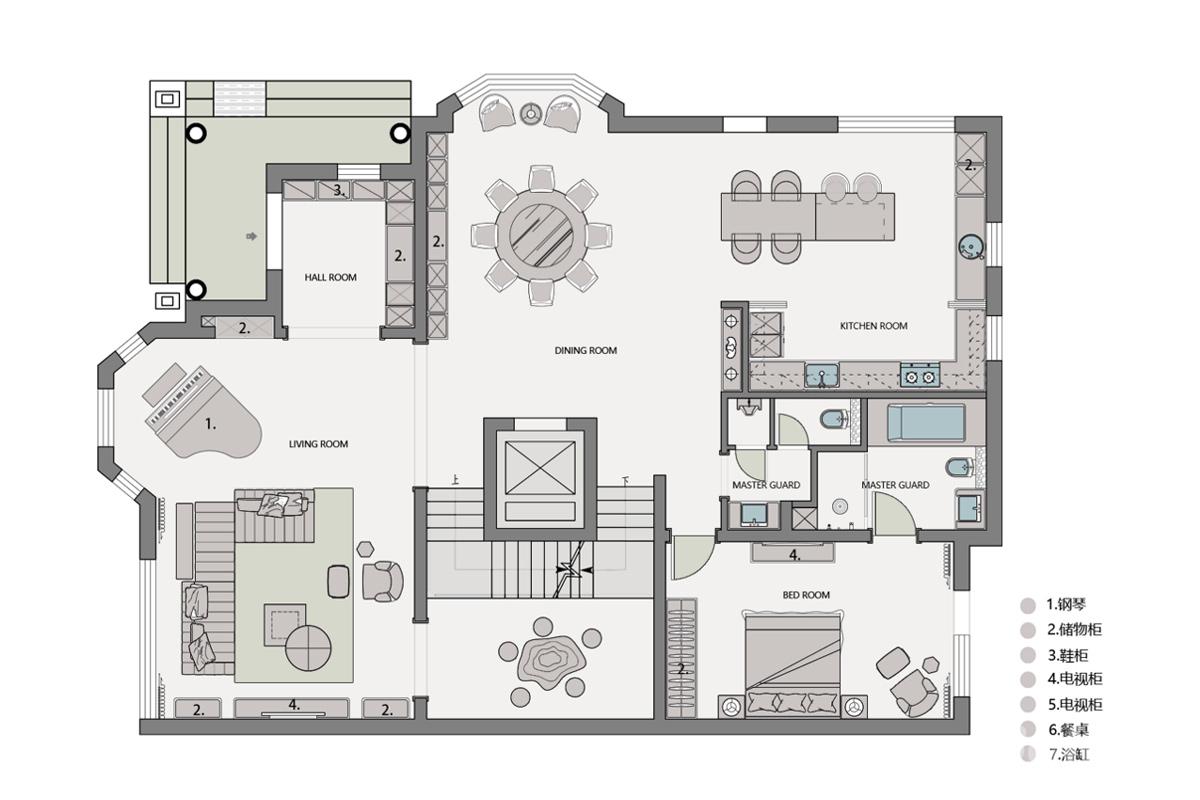 一楼以 “公区开放、私密独立” 为原则,打造一体化的家庭生活层。入户玄关衔接开阔客餐厅,钢琴区、客厅与餐厨空间连贯通透,营造出温馨的家庭互动氛围。南向卧室套房的设计,让长辈居住也能拥有舒适的私密空间。