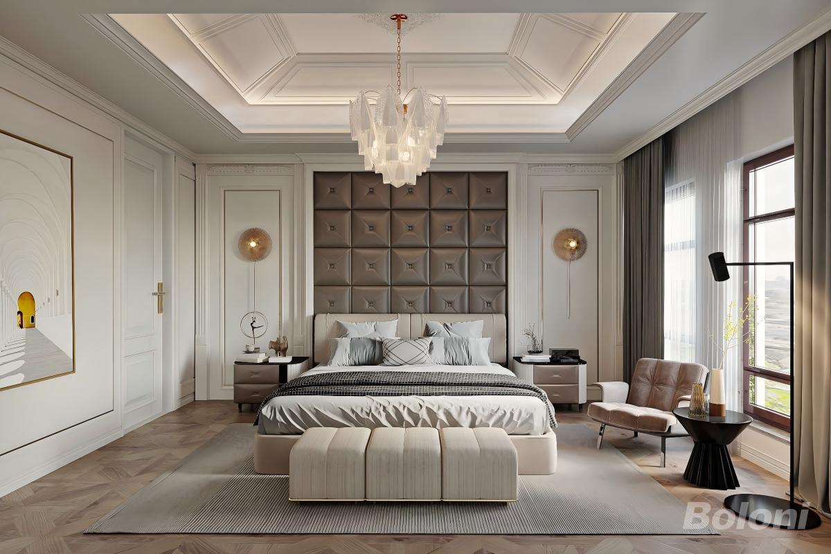三楼以「主人专属」为设计核心,打造了一处集休憩、卫浴与收纳于一体的私密套间。开阔起居区与卧室相连,配备双步入式衣帽间与带浴缸的独立卫浴,动线流畅、功能齐全,为屋主营造出不受打扰、舒适放松的专属生活空间。