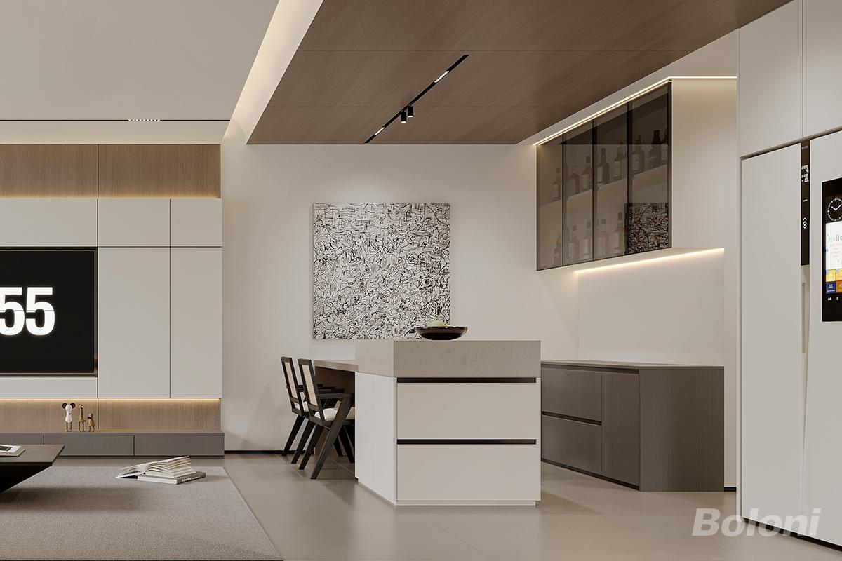 这是一套意式极简客餐厨一体化空间,开放式布局让客餐区自然衔接,动线流畅通透。中岛台衔接餐桌,兼顾操作与简餐功能,实用又有设计感。右侧玻璃门酒柜内嵌暖光灯带,兼顾藏酒收纳与展示。木作吊顶搭配线性照明,黑白抽象装饰画注入艺术感,低饱和色调与温润材质碰撞,打造出低调高级、松弛有序的意式居家氛围。