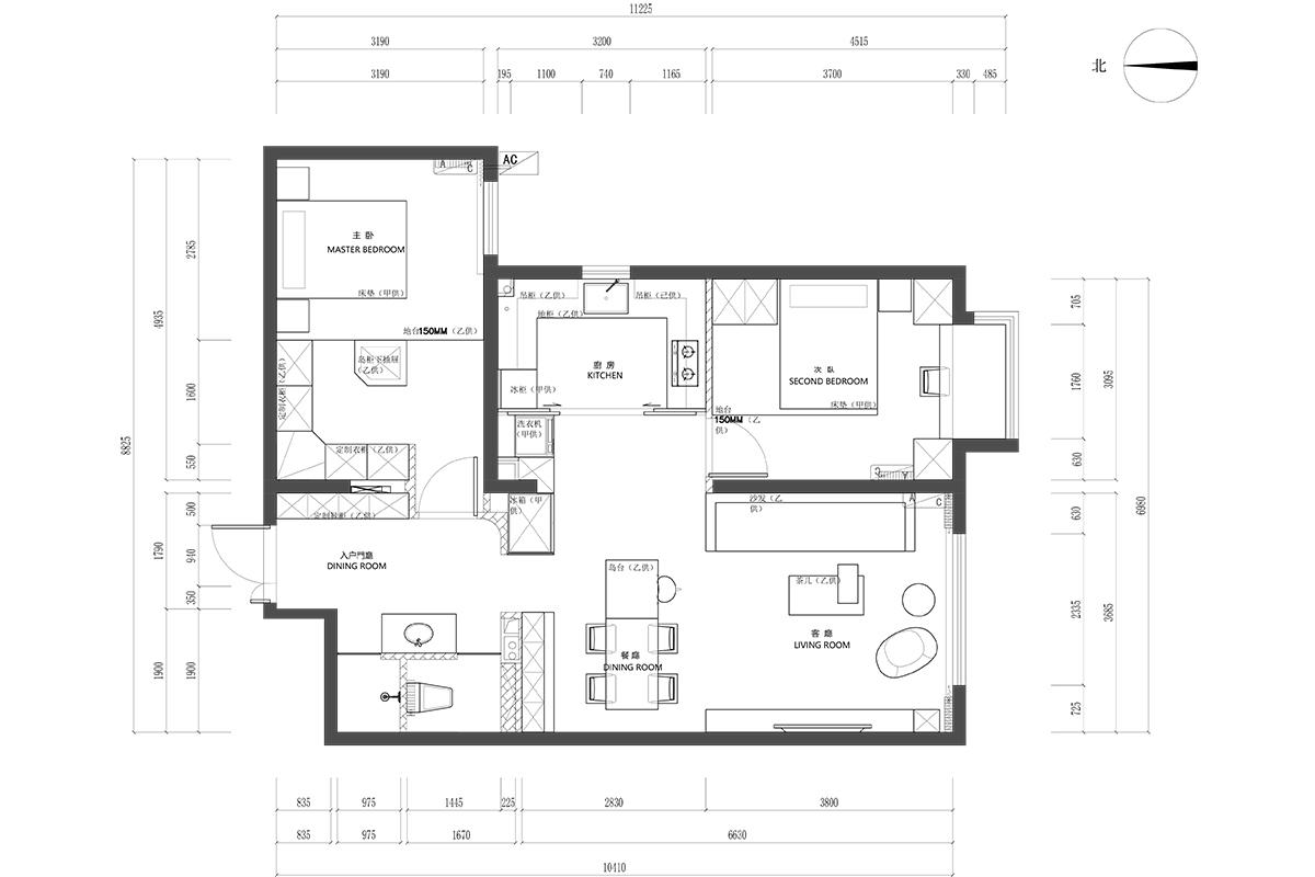 本方案为两居户型优化设计,采用 LDK 一体化布局,打通客餐厨与厨房的空间边界,打造通透开阔的公共活动区,最大化利用南侧采光面,让公共区采光充足、动线流畅。 入户区设置满墙定制收纳柜,兼顾鞋帽、杂物收纳,解决小户型入户收纳痛点。家政区整合至厨房过渡空间,洗衣机、冰箱有序排布,功能集约不浪费面积。静区规划双卧室,主卧配置定制通顶衣柜,预留充足储物空间;次卧兼顾多元使用需求,整体动静分区清晰,在有限面积内,实现了功能齐全、通透舒适的现代居家体验,最大化提升空间利用率。