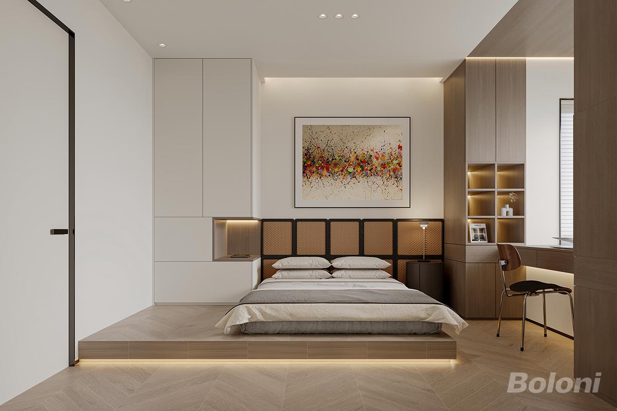 这是一套意式极简多功能房,地台床搭配底部氛围灯,轻盈有质感,藤编靠背床头注入温润细节。左侧通顶衣柜错落设计,内嵌暖光开放格,兼顾收纳与展示。右侧 L 型书桌衔接展示柜,打造出独立的办公区,兼顾书房功能。彩色抽象画点亮低饱和空间,整体功能集约,在小空间里实现了客房、书房、储物的全能需求,高级又实用。