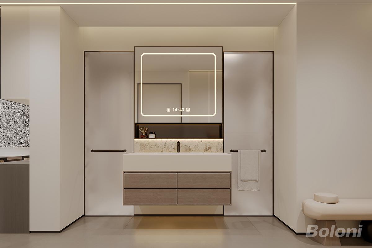 这是一套意式极简三分离卫生间,干区外置的设计,让洗漱、如厕、洗浴三区独立,可同时使用,高效不冲突。悬浮洗手柜搭配带灯智能镜,大花白石材背板点缀,简约又有质感。奶白门搭配细金属收边,右侧搭配软包长凳,兼顾使用舒适度。整体低饱和色调贯穿,无冗余装饰,打造出整洁高级、功能齐全的治愈卫浴空间。