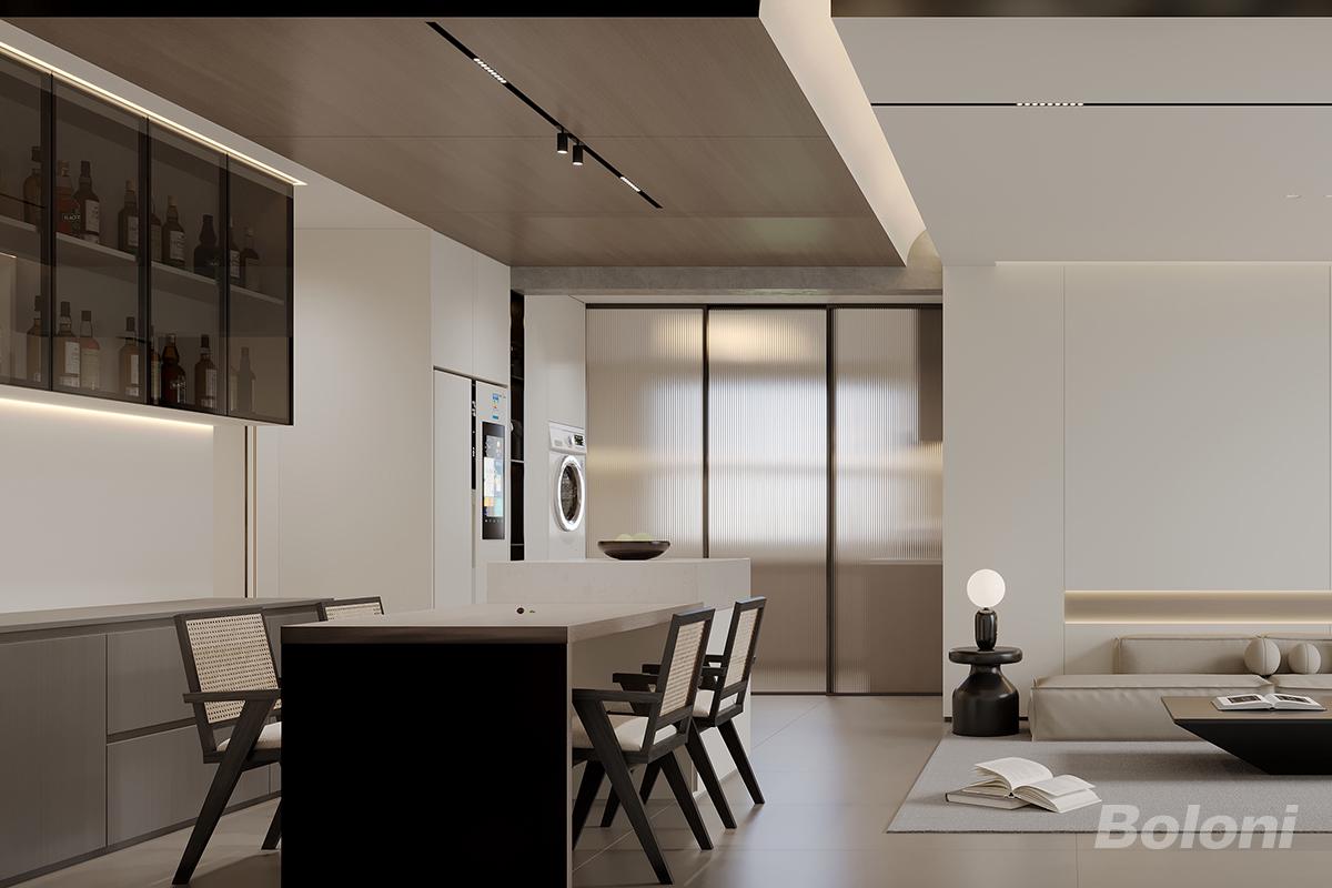 这是一套意式极简的全能公共区,客餐厨与家政区一体化整合,功能集约又通透。长虹玻璃推拉门巧妙隐藏家政区,隔断油烟的同时不遮挡采光,兼顾整洁与实用。左侧玻璃酒柜内嵌暖光灯带,岛台搭配藤编餐椅,温润材质碰撞出高级质感。木作吊顶搭配线性照明,低饱和色调贯穿全场,打造出低调有序、颜值与功能兼具的意式居家空间。