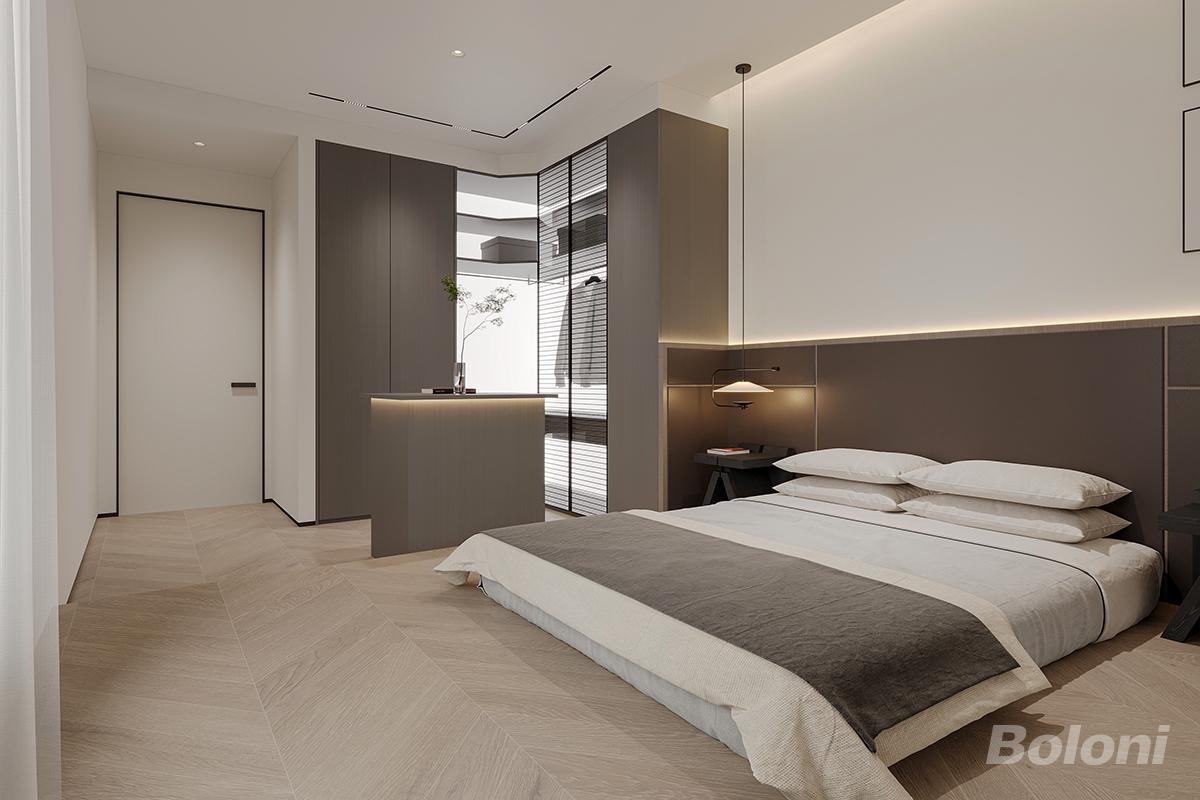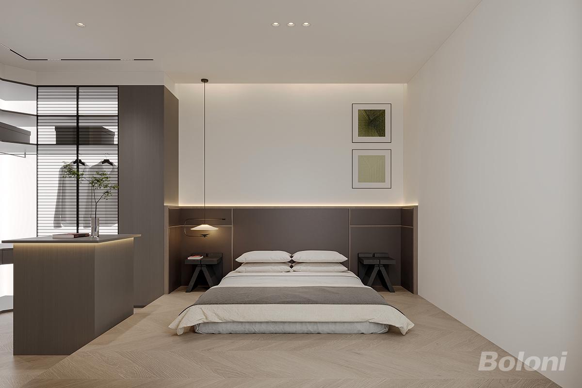 这是一套意式极简主卧,L 型转角衣帽间采用百叶玻璃半隔断,划分功能区的同时不遮挡采光,通透又兼顾隐私。悬浮床搭配深棕床头背景墙,线性氛围灯与床头小吊灯,营造出温柔的睡眠氛围。人字拼木地板温润有质感,整体低饱和色调贯穿,克制无冗余装饰,打造出静谧高级、功能齐全的专属休憩空间。