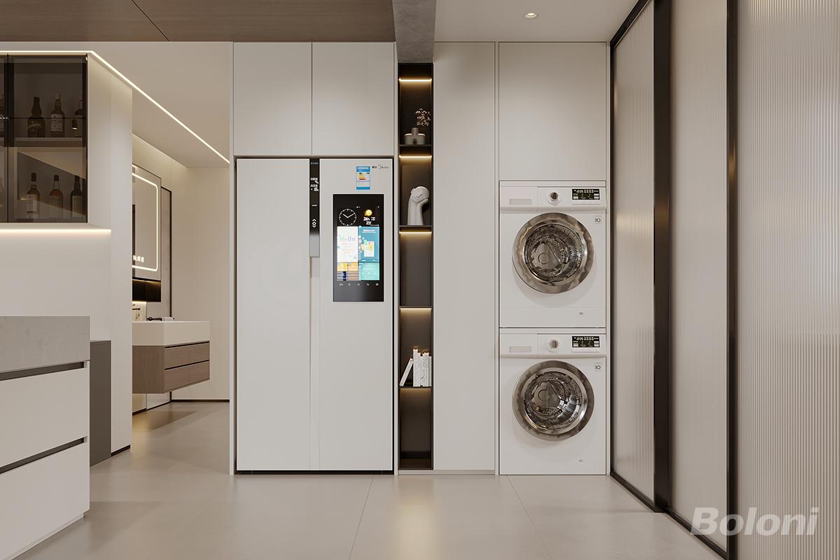 这是一套意式极简一体化家政区,通顶定制柜将大屏冰箱、洗烘套装完全嵌入,完美隐藏家电,让空间整洁利落。中间预留了错落的暖光开放格,兼顾杂物收纳与展示,填补了功能区的单调感。整体低饱和奶白调贯穿,与全屋风格统一,无冗余装饰,在有限的空间里集约了家政、储物功能,打造出颜值与实用兼具的整洁家政空间。