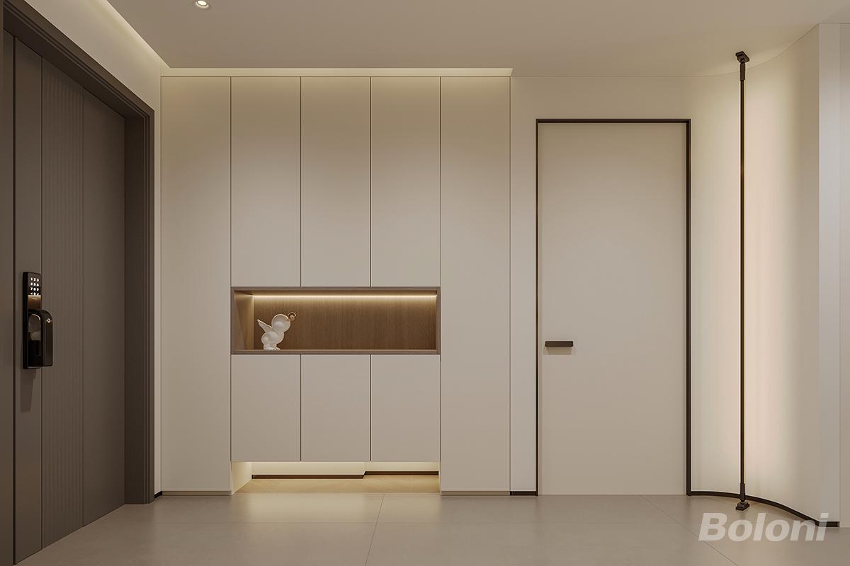 这是一套意式极简入户玄关,通顶无拉手鞋柜做了一体化设计,干净利落。中间内嵌暖光开放格,兼顾展示与随手收纳,底部悬空区预留换鞋空间,搭配氛围灯,细节拉满。右侧弧形阳角搭配金属线条,柔化了空间棱角,弱化尖锐感。整体低饱和奶白调贯穿,无冗余装饰,用克制的设计与细节灯光,打造出整洁高级、充满仪式感的归家第一印象。