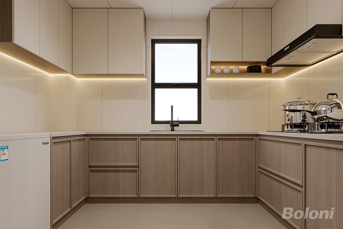 这是一套意式极简 L 型厨房,奶白与浅木色撞色橱柜,无拉手设计干净利落,贯彻了意式克制美学。台下线性氛围灯补足操作区照明,细节实用又有质感。通顶橱柜预留充足收纳空间,右侧开放格方便随手取用餐具,大窗引入充足采光,让小厨房也通透明亮。整体动线流畅,功能齐全,打造出整洁高级、舒适高效的烹饪空间。