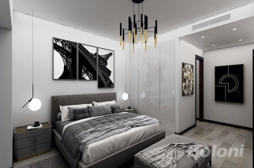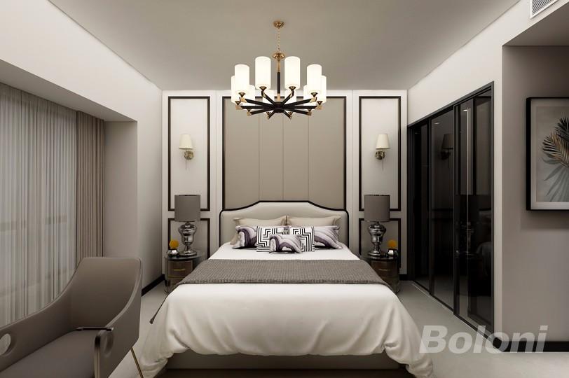 卧室是整套房子中最私人也是最体现出温馨休闲,宁静、柔和的颜色会带来耳目一新的感觉,整体的线条与家具弧线相融合,给人以温馨、自然。