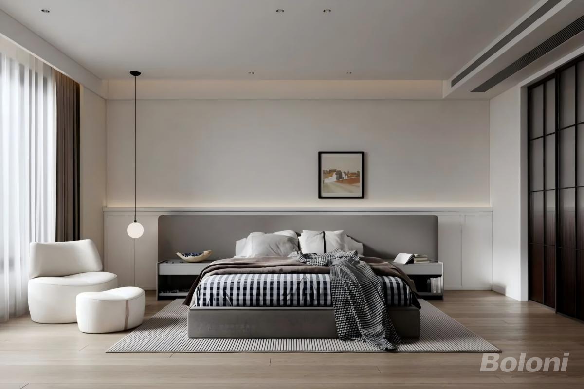 这份轻美式卧室以柔和米白与低饱和灰为主调,保留美式优雅的同时简化线条:软包床头 + 线条护墙呼应经典元素,黑白格纹床品增添复古质感,搭配简约单椅与球形灯,弱化厚重感,让空间在舒适松弛中透出精致格调。