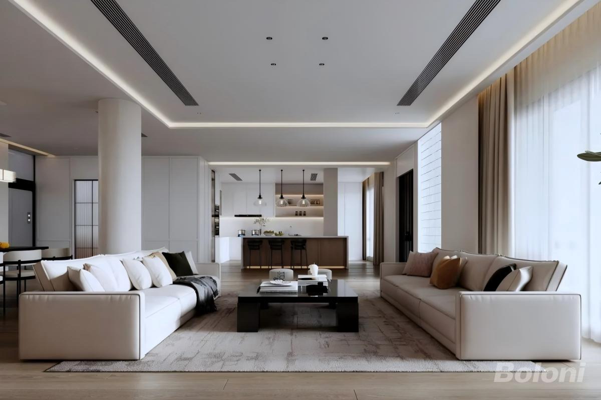 本客厅以轻美式现代为风格,浅暖主调铺陈柔和基底,通厅布局联动餐厨区,隐形收纳与无主灯设计简化视觉,皮质沙发配质感软装,既保留美式舒适松弛,又以极简线条适配当代生活,灯光与通透格局交织出开阔温馨的起居氛围。