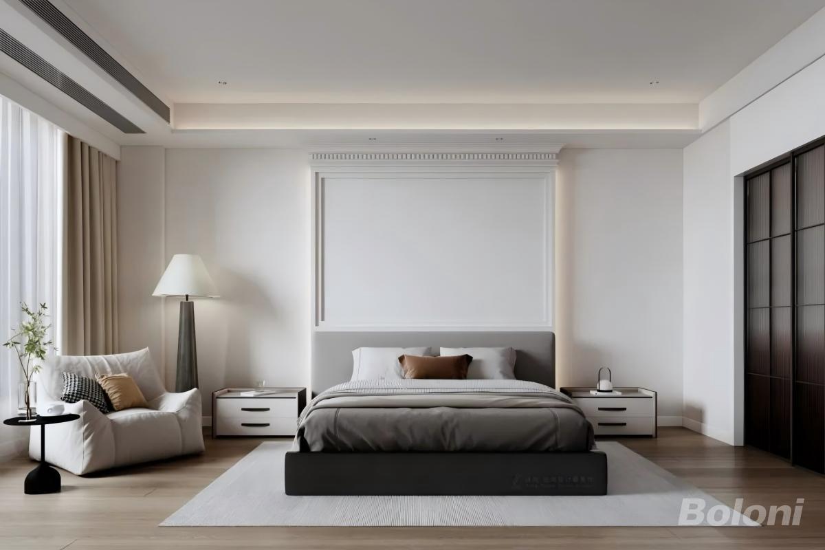 本卧室以轻美式柔居为风格,白调基底配复古石膏线,浅灰床具与暖棕软装呼应美式松弛感,隐形收纳与无主灯设计简化视觉,落地灯与休闲椅营造静谧角落,既保美式温馨内核,又以现代极简手法适配舒适休憩场景。