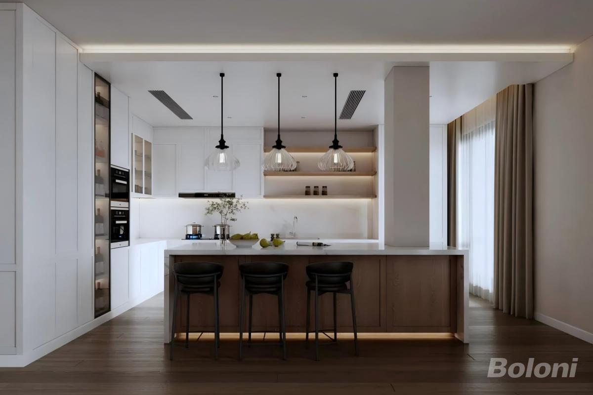 本厨房以轻美式轻奢为风格,白调柜体 + 暖木色岛台铺陈柔和基底,玻璃柜门与复古吊灯呼应美式质感,嵌入式厨电兼顾整洁与功能,氛围灯点缀层次,既保美式厨房的温馨松弛,又以现代极简手法适配当代烹饪与社交场景。