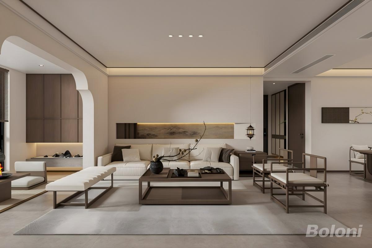 本客厅以新中式为风格,浅暖基底衬出雅致氛围,月洞门、格栅椅呼应传统形制,山水饰画与枯枝花器点睛东方意境,无主灯与隐形收纳简化视觉,既保中式禅意内核,又以现代手法平衡舒适与美学,营造松弛的东方起居空间。