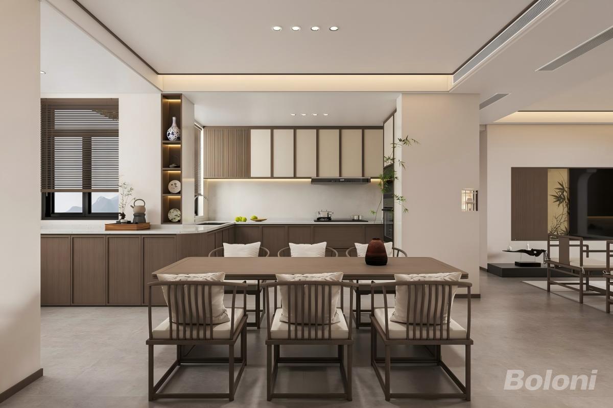 本餐厨区以新中式为风格,暖木色柜体衬出雅致基底,格栅门、瓷瓶摆件呼应传统元素,氛围灯与山水窗景点睛东方意境,既保中式禅意质感,又以嵌入式厨电兼顾功能与整洁,现代手法与传统美学相融,营造舒适的东方餐厨空间。