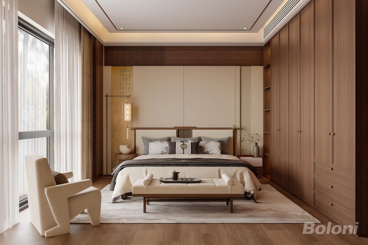 本卧室以新中式为风格,暖木色与浅调铺陈雅致基底,书法饰墙、格栅床头呼应传统元素,宫灯落地灯点睛东方意境,隐形收纳兼具体用与整洁,既保中式禅意静谧,又以现代软装柔化氛围,营造松弛舒适的东方休憩空间。
