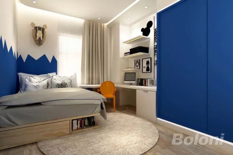 五颜六色的城乡结合部式色彩搭配,绝不是儿童房的标配。对于5岁以下的儿童来说,视力发育还没有完全,并不适合高明度、高饱和的色彩。而对于稍大一点的孩子来说,颜色成为了个性宣言,最好依据孩子的喜好来设计。
