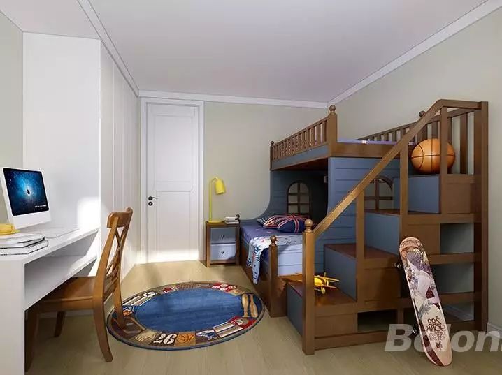 许多儿童房,都采用了上下床的设计,给儿童开辟出更大的活动空间,也符合孩子爬上爬下玩耍的天性。另外,也可以在床的设计上动一些巧思,别致又充满趣味。
