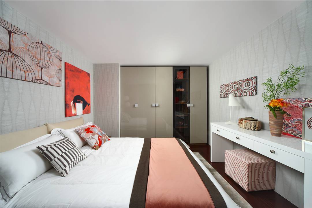 这是适合较大卧室的摆放方法,可根据床头后面墙角空地的大小再摆放一个储物柜。