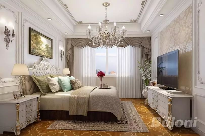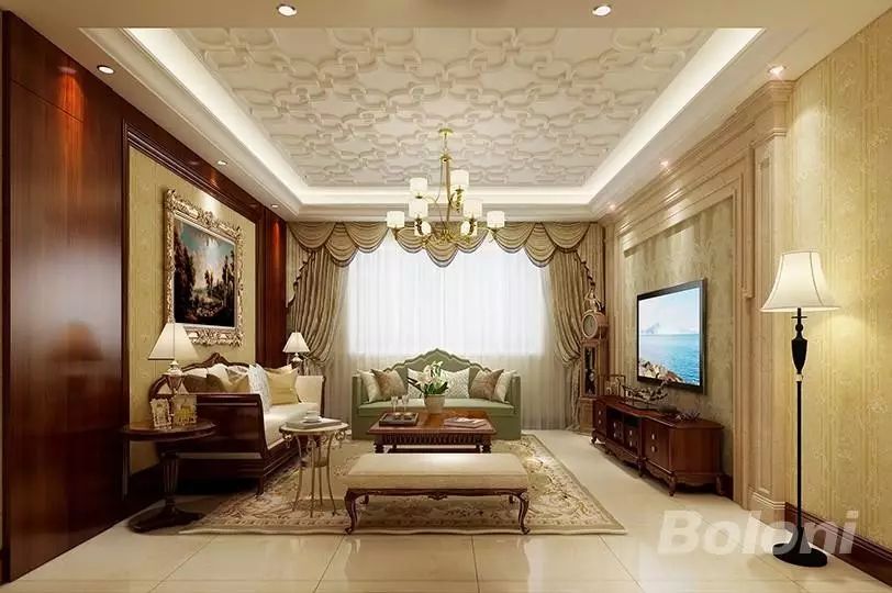 欧式风格采用白色、淡色为主,以淡色的色调对比跳跃的沙发靠垫颜色。家具主要特色是强调力度、变化和动感,沙发华丽的布面与精致的雕刻相互配合。门的设计有突出的凹凸感,又有优美的弧线,两种造型相映成趣,风情万种。