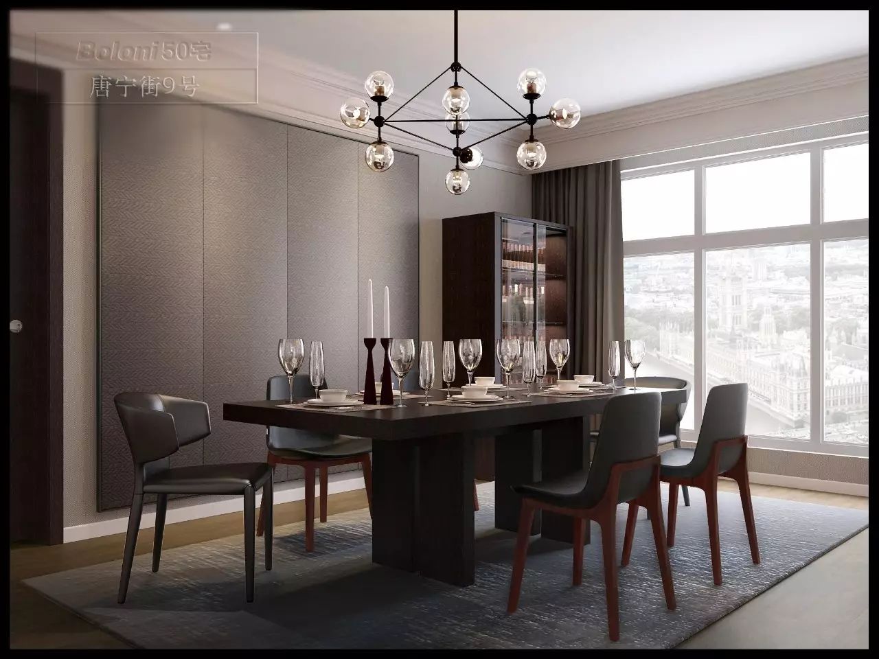 餐厅空间12件套:餐厅背景墙+边柜+餐桌+餐椅(6)+吊灯+窗帘(2)