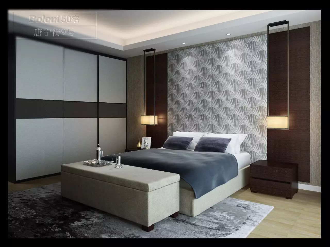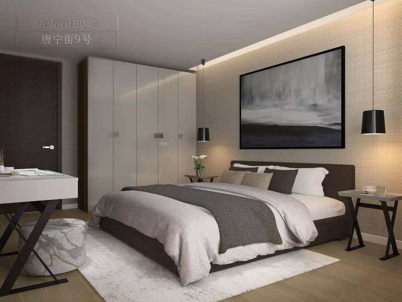 △ 次卧1丨白色球型床头灯在灰色菱形纹背景墙下典雅大方,鸵鸟皮移门腰线衣柜低调得体,床底有足够的收纳空间,撑大空间视觉却不觉拥挤。