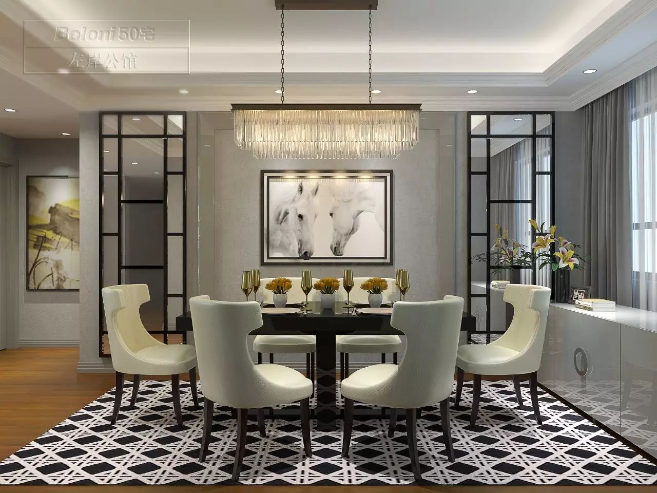 △ 餐厅丨中式线条框明镜,与流苏状水晶吊灯再加上白色亮光烤漆餐边柜增加了餐厅的通透型,白色皮质餐椅尽显古典气质。