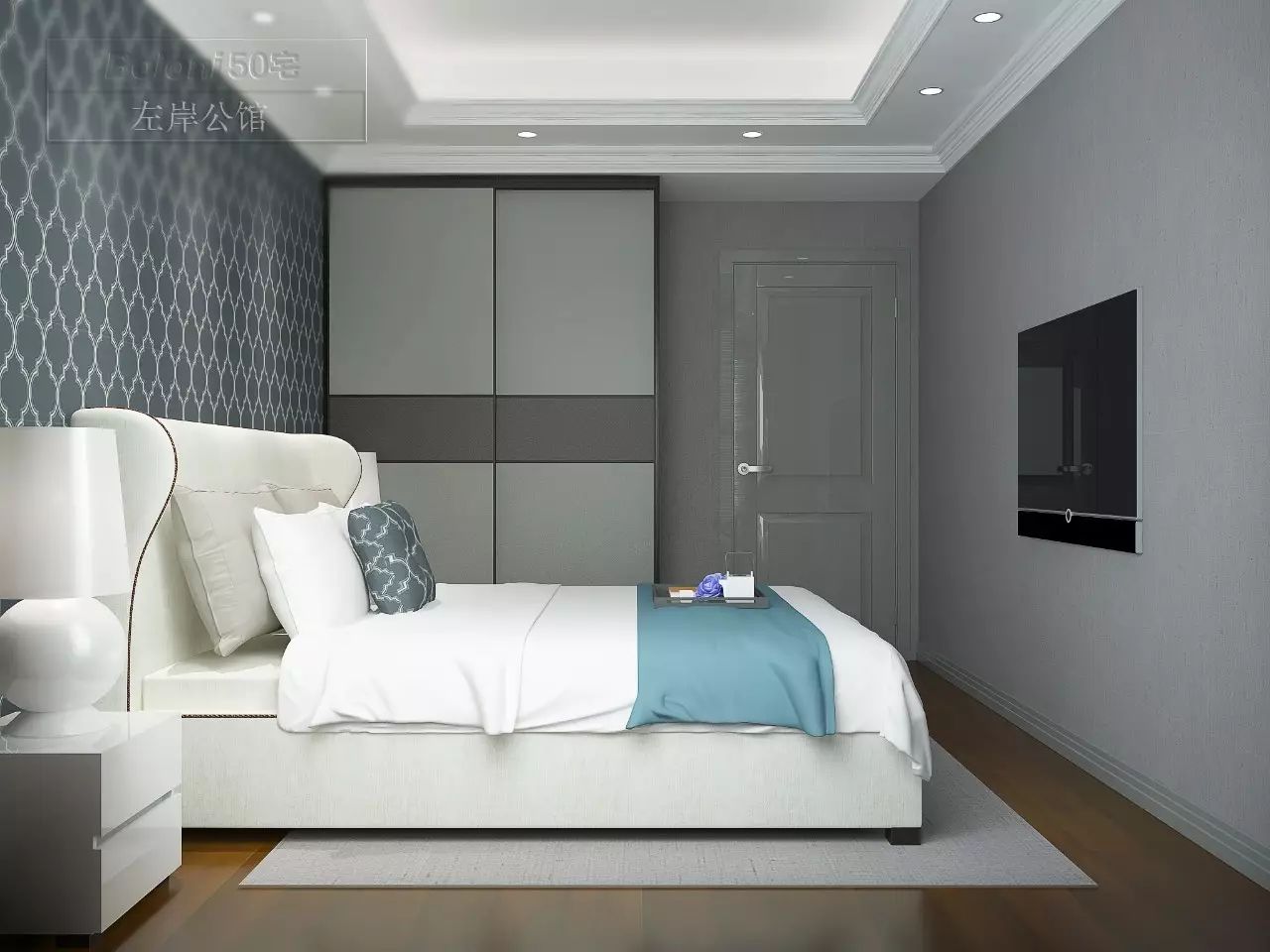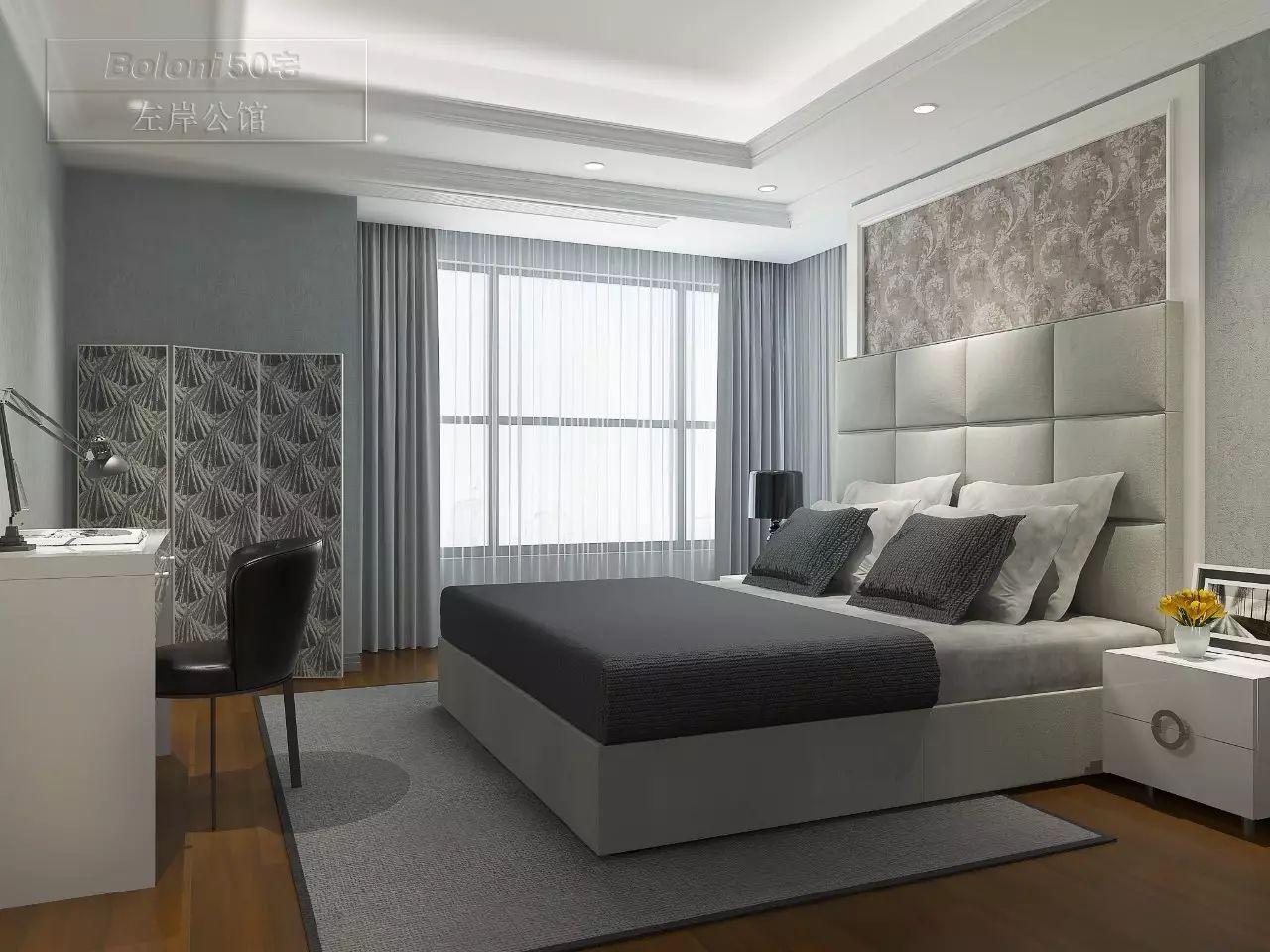 △ 主卧丨如何让高级灰更高级?看这卧室的奢侈品面料扇形背景墙就知道了,而且还可以直接代替床头更与众不同,床底具有收纳功能。白色华沙休闲椅造型独特,犹如穿着白色礼服的优雅女伶。