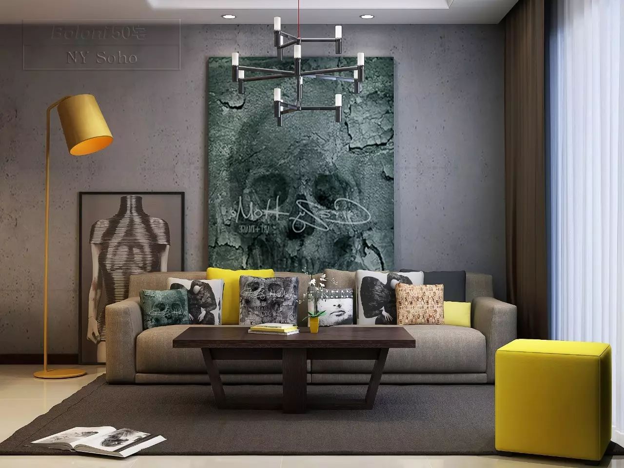 △ 客厅丨在高级灰的空间中,铁艺的落地灯成为当今复古潮流的首要趋势,绿色骷髅头打印背景墙与抱枕向伟大的设计师亚历山大・麦昆致敬,巧克力厅柜明黄调色插入格与明黄色方墩扭转了过于酷暗黑的工业风,同时满足了LOFT小空间收纳需求。