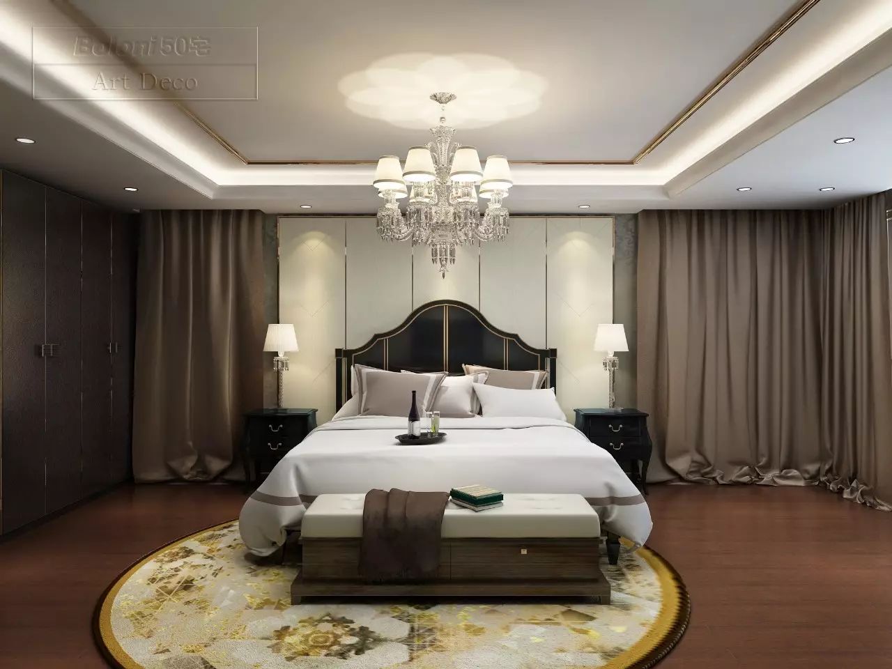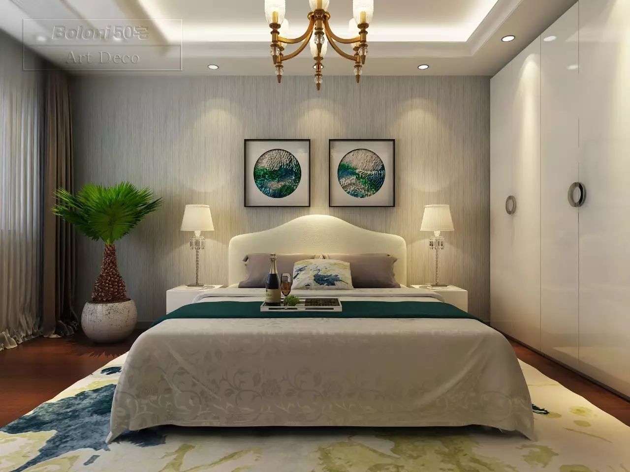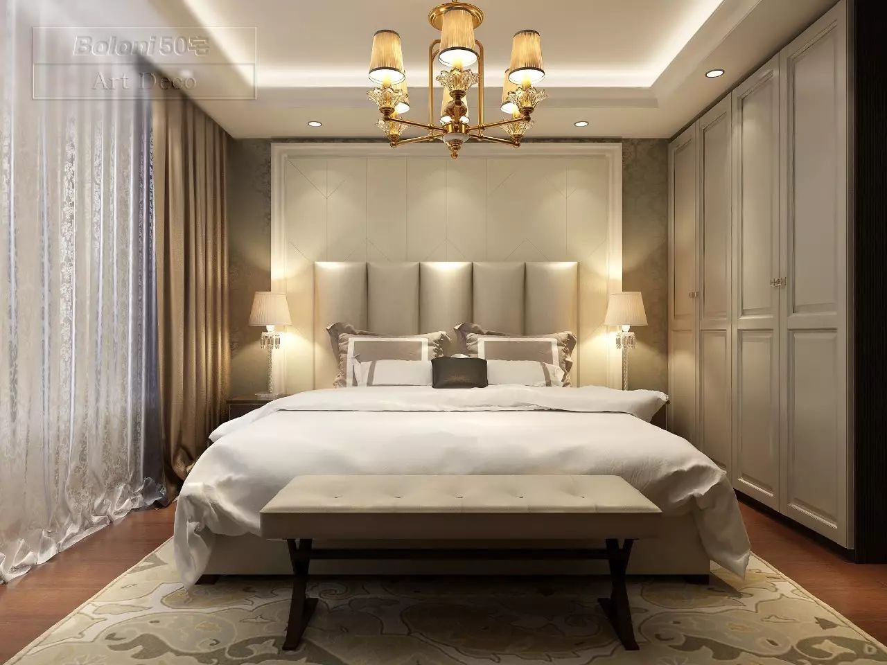 △ 次卧2丨水晶灯、太阳型装饰镜、奶油灰嵌金墙板包皮墙组合,就连壁纸都是Art Deco的金属色,衣柜腰线编织皮极具个性和质感,极具质感的古典奢华气息令人陶醉其中,床底收纳可将不常用的物品整理其中,最大化利用空间。