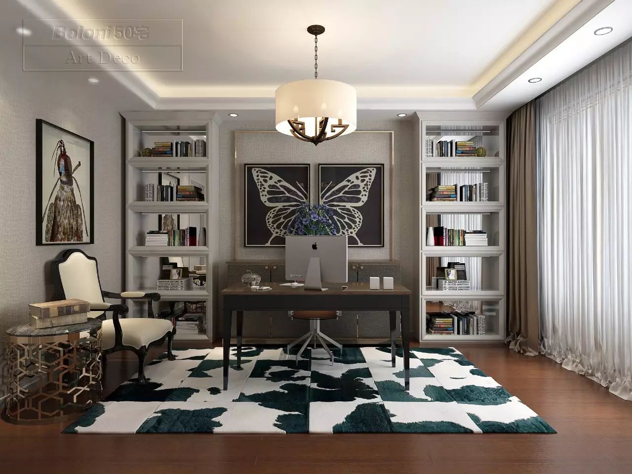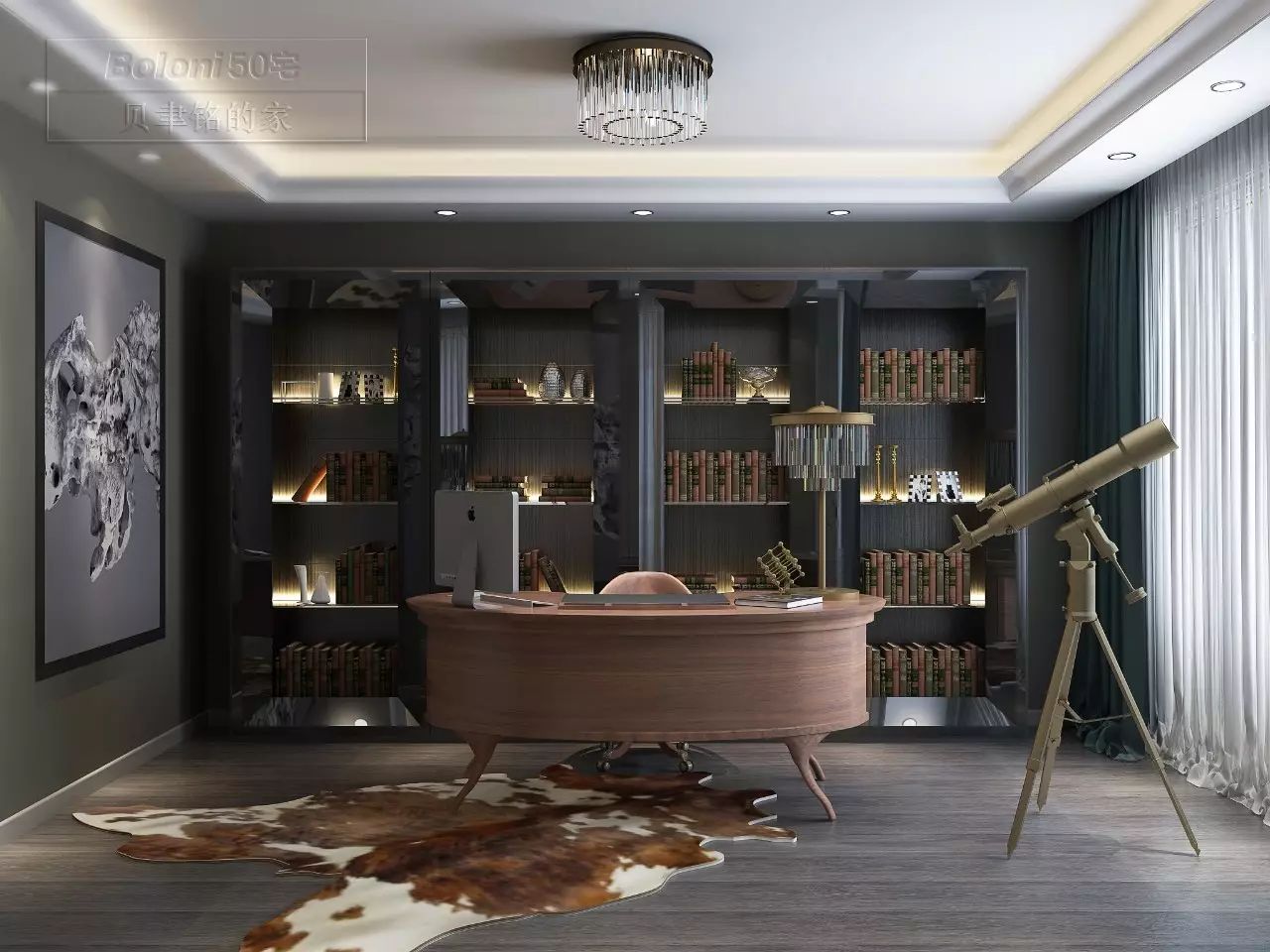 △ 书房丨深色烤漆框书柜充满了主人对天文地理无穷无尽的求知欲,45°拼接外框,16公分厚的质感体现了博洛尼工艺的精湛,黑胡桃实木书桌椅更能体现年代感;牛皮地毯带来的天然的野性美,你感受到了吗?