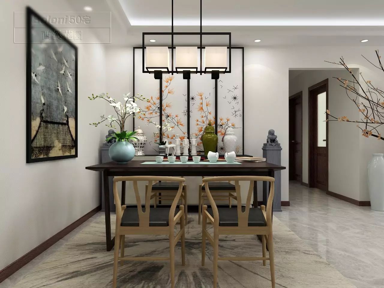 餐厅空间9件套:餐桌+餐椅(4)+边柜+灯+窗帘(2)