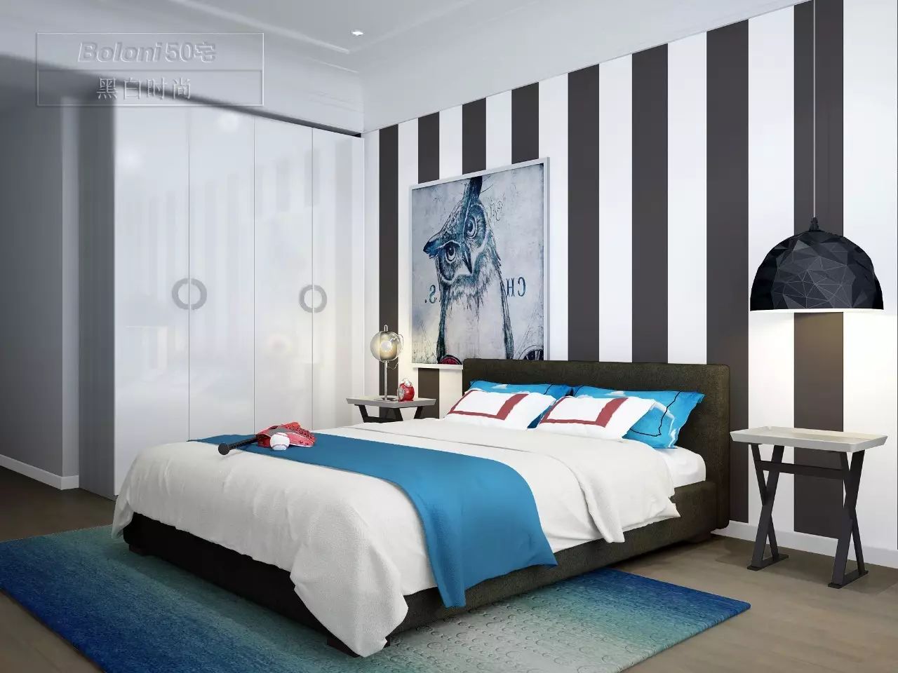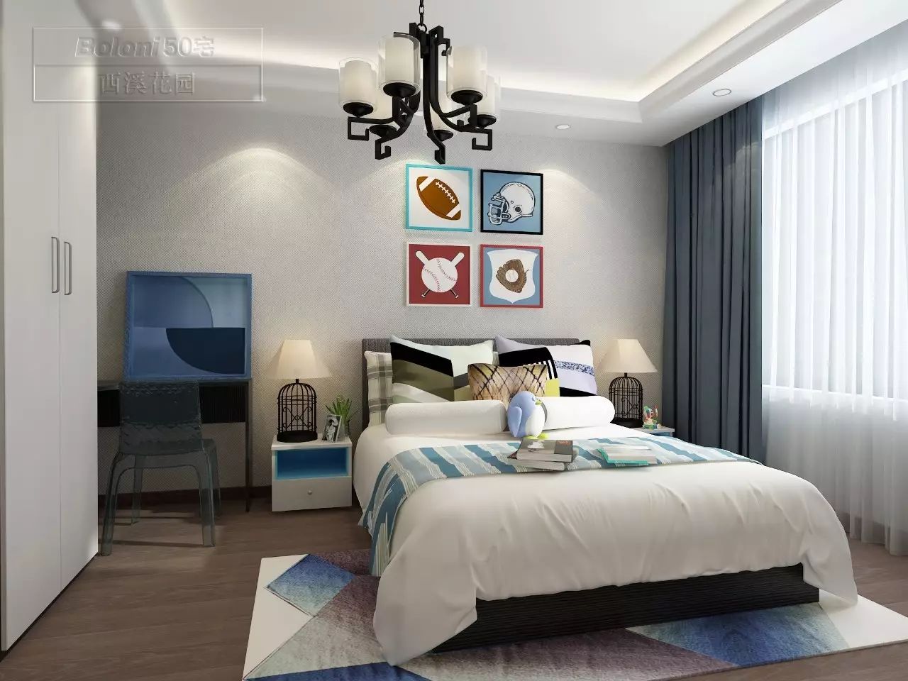 △ 男孩房丨充满活力的蓝色男孩房也不能忘记时尚的使命,具有艺术气息的黑色吊灯与别致的X型角几床头柜激发孩子的审美,黑白线条致敬达达主义,圆角墩还能收纳孩子的物品。