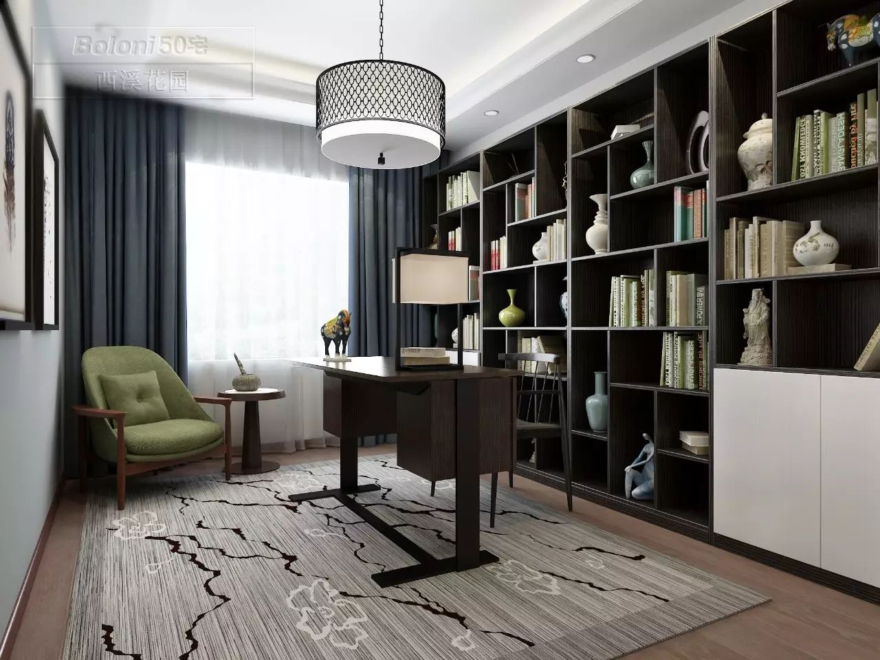 书房空间6件套:现代书柜+办公桌+转椅+灯+窗帘(2)