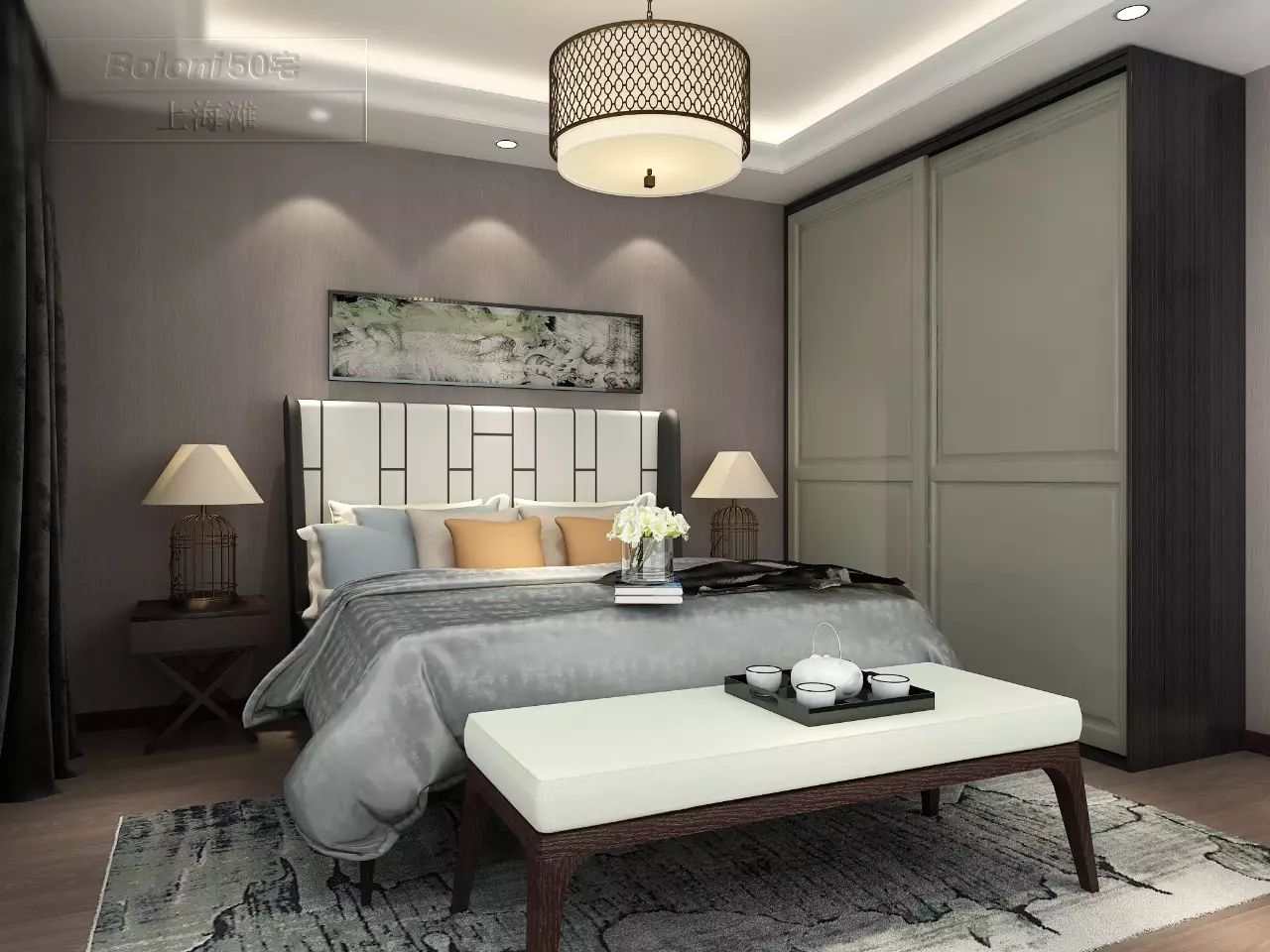 △ 主卧丨主卧是最显出士大夫精神的空间:木栅墙板散发着浓浓的中国香,床头采用烤漆板+软包材质,硬朗贯穿的空间中不乏柔情,床底具备收纳功能;床头柜采用中式对开门,两个半圆拉手寓意圆满。