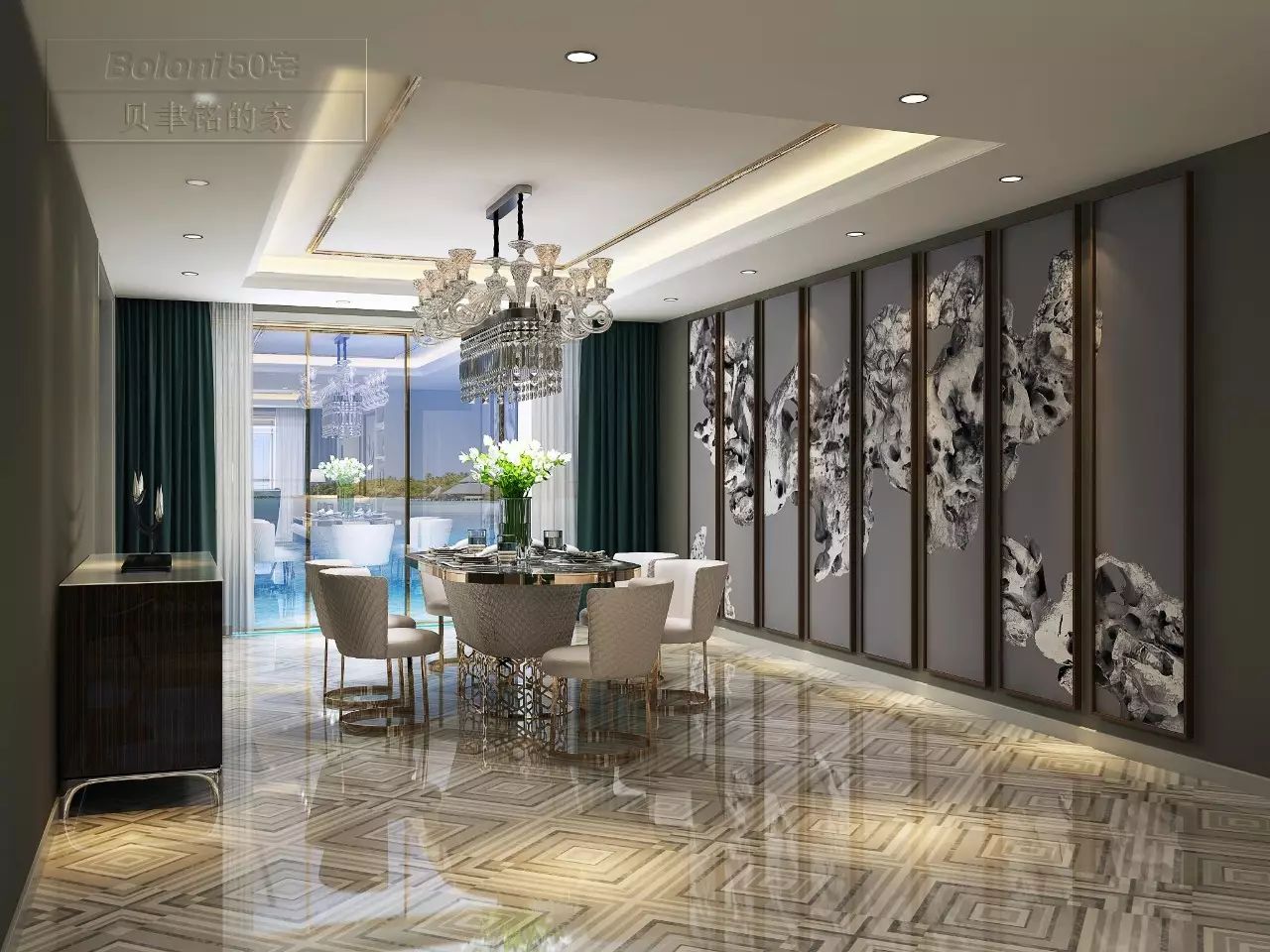 △ 餐厅丨在餐厅,你更能感受到主人细节之柔美。古木纹大理石台面餐桌中部采用工艺复杂的绗缝皮,绗缝皮钛金椅一套就和外面的“妖艳货”不一样;太湖石图案打印背景墙用铝框包边,精致尔雅。