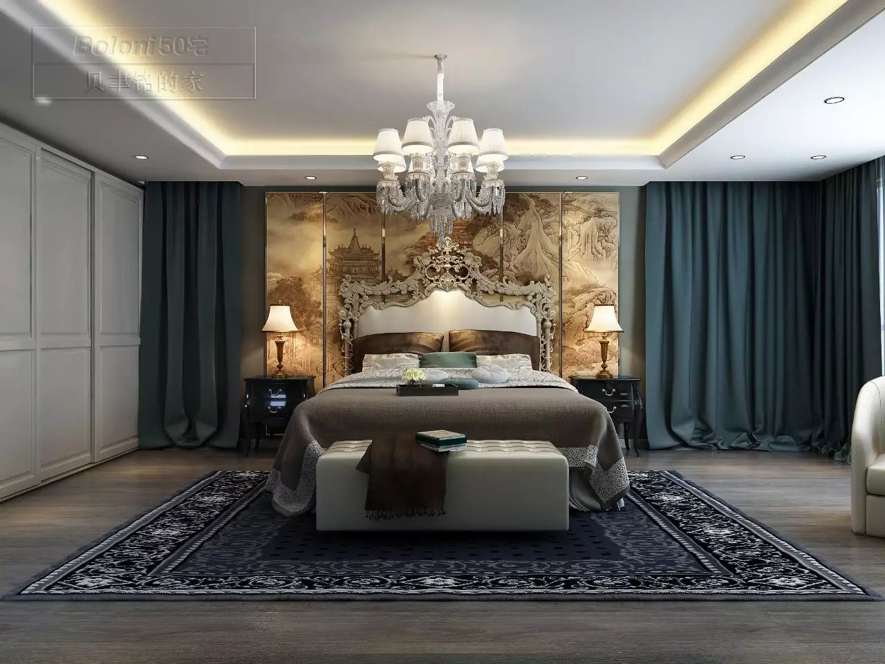 △ 主卧丨欧式造型的豪华大床,采用原木搓丝,繁复的雕刻工艺的床头,是否让你想起了欧洲中世纪的教堂?而蓬莱仙境的背景墙延续国际手法结合当代中国气质,更带给人错落时空的感慨。