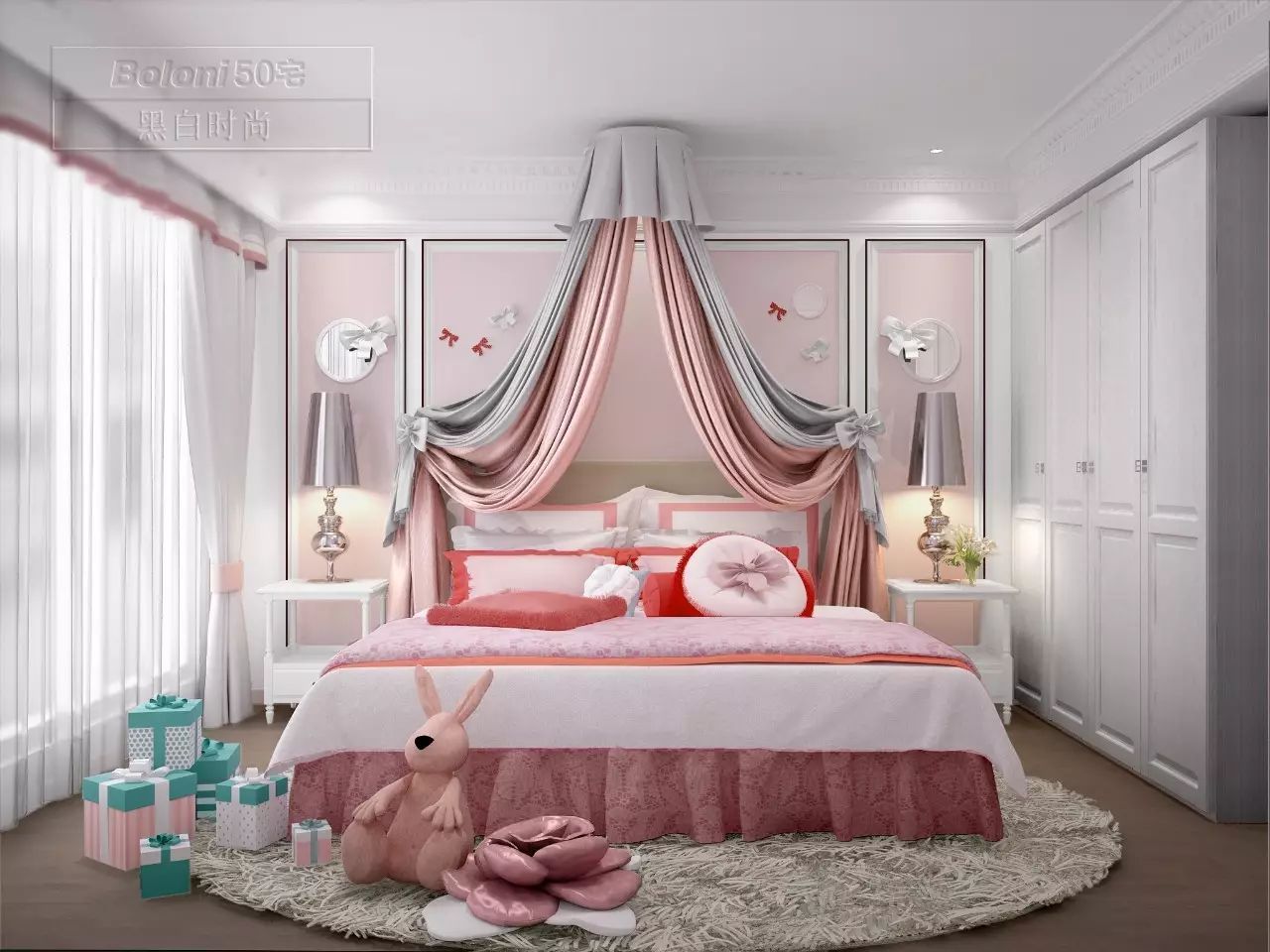 △ 女孩房丨古典烤漆线条的墙板加深了历史元素,轻奢的包覆铝框平开门衣柜纯洁高雅,而粉色在白色的包裹下更显得纯真和梦幻,床底还能收纳许多孩子的心爱之物。