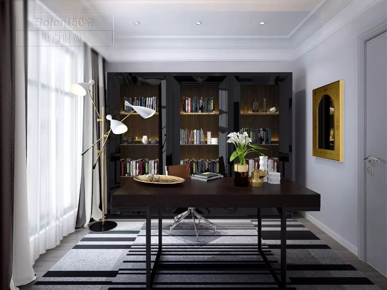 △ 书房丨书柜采用黑色烤漆边框,如同黑曜石一般散发着神秘时尚的光辉,奢华简约的椅子便点出了空间意大利元素的主题。