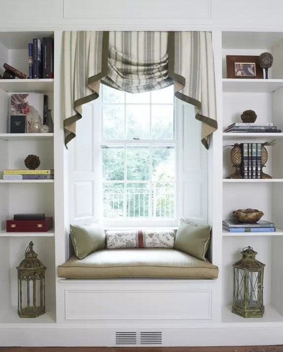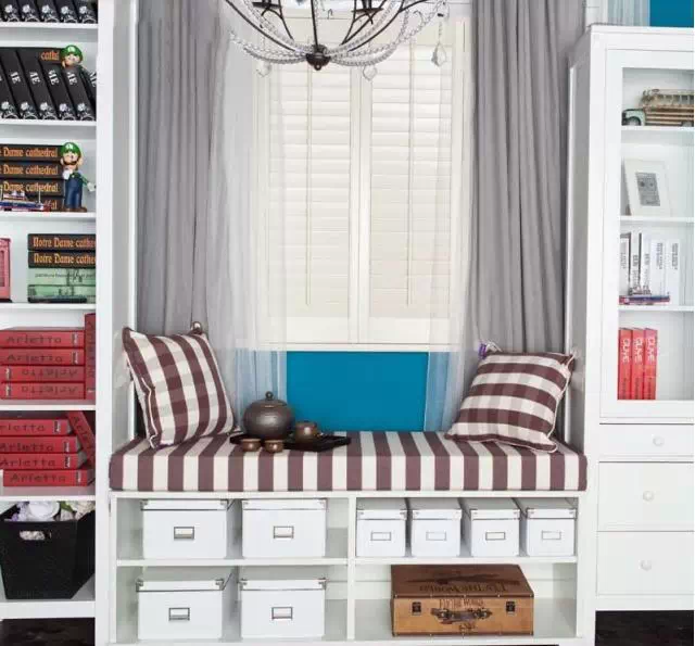 如果窗户底部没有墙体,面积又比较窄,保留原始形态有点浪费,可在底部设计收纳柜,再铺上彩色的小垫子,搭配小碎花的窗帘,就变成了一个充满浪漫氛围的小角落。