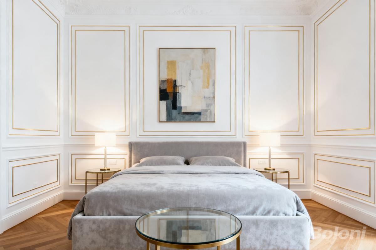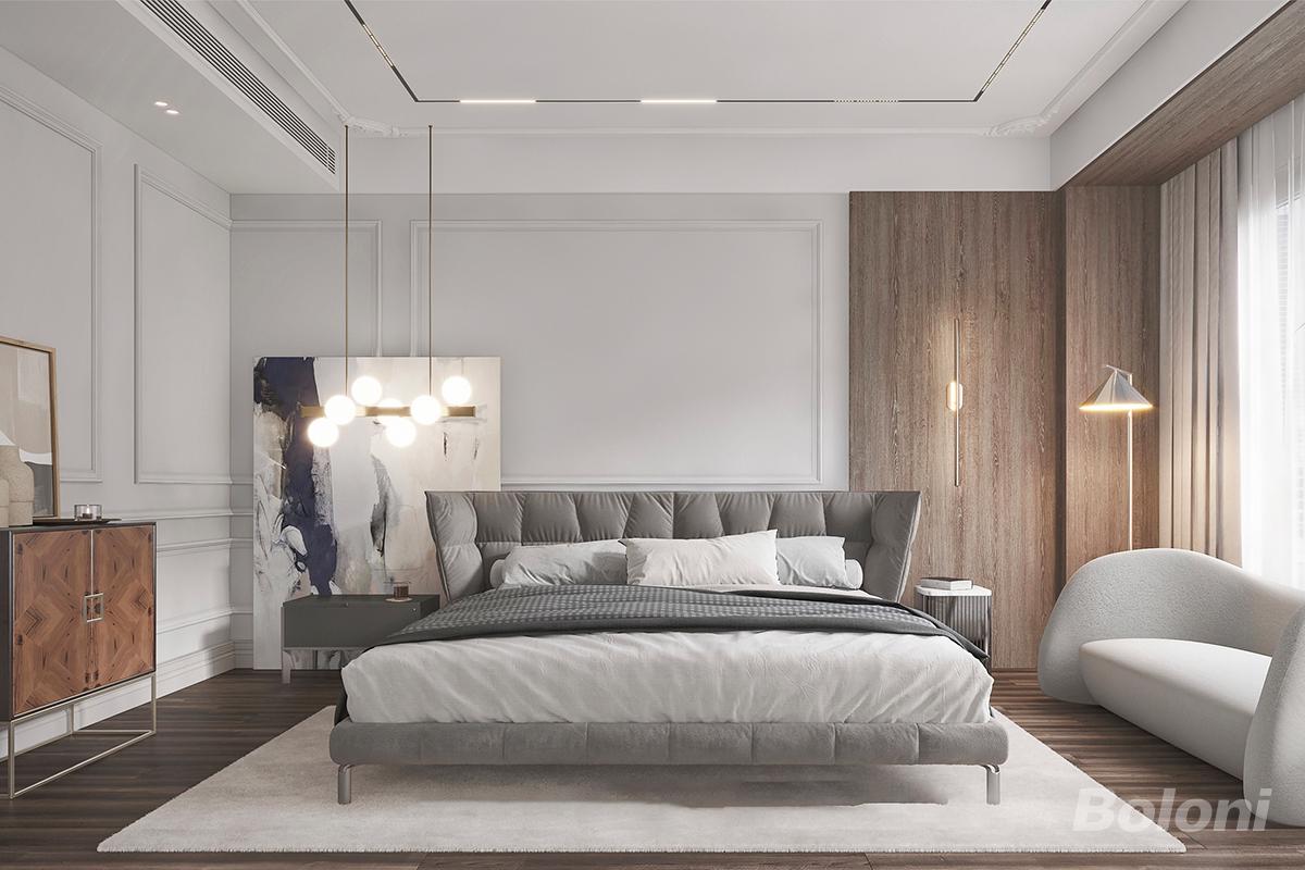 本卧室设计以法式风格为核心,白色墙面搭配金色线条勾勒精致轮廓,几何抽象画增添艺术感,浅灰床品与玻璃圆几融合,营造优雅、静谧且具格调的休憩空间 。