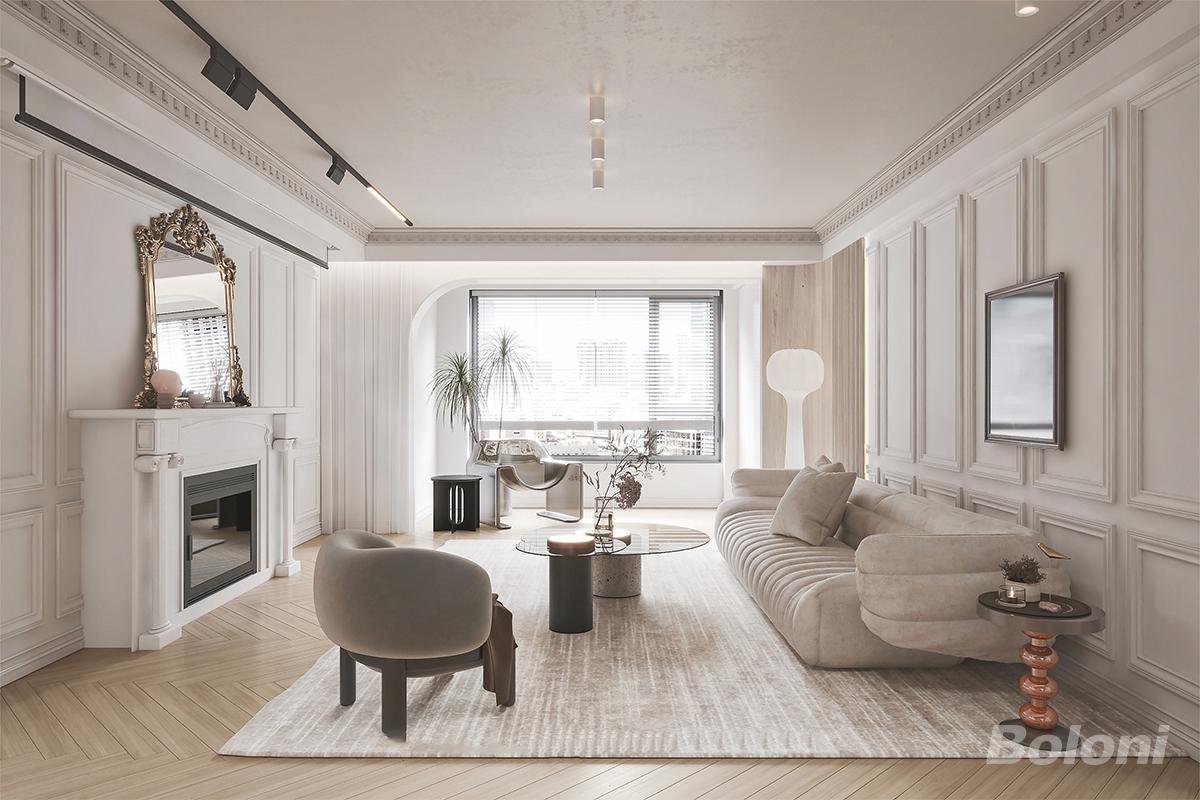 这是一个充满了浪漫与优雅的气息。天花板和墙上的雕花石膏线,如同精美的艺术品,细腻而精致。浅灰色的沙发围绕着圆形的茶几,茶几上的金色托盘里摆放着精致的茶具,仿佛随时准备迎接一场惬意的下午茶时光。壁炉上放着的金色镜子,反射出室内的美景,给人一种温馨舒适的感觉。