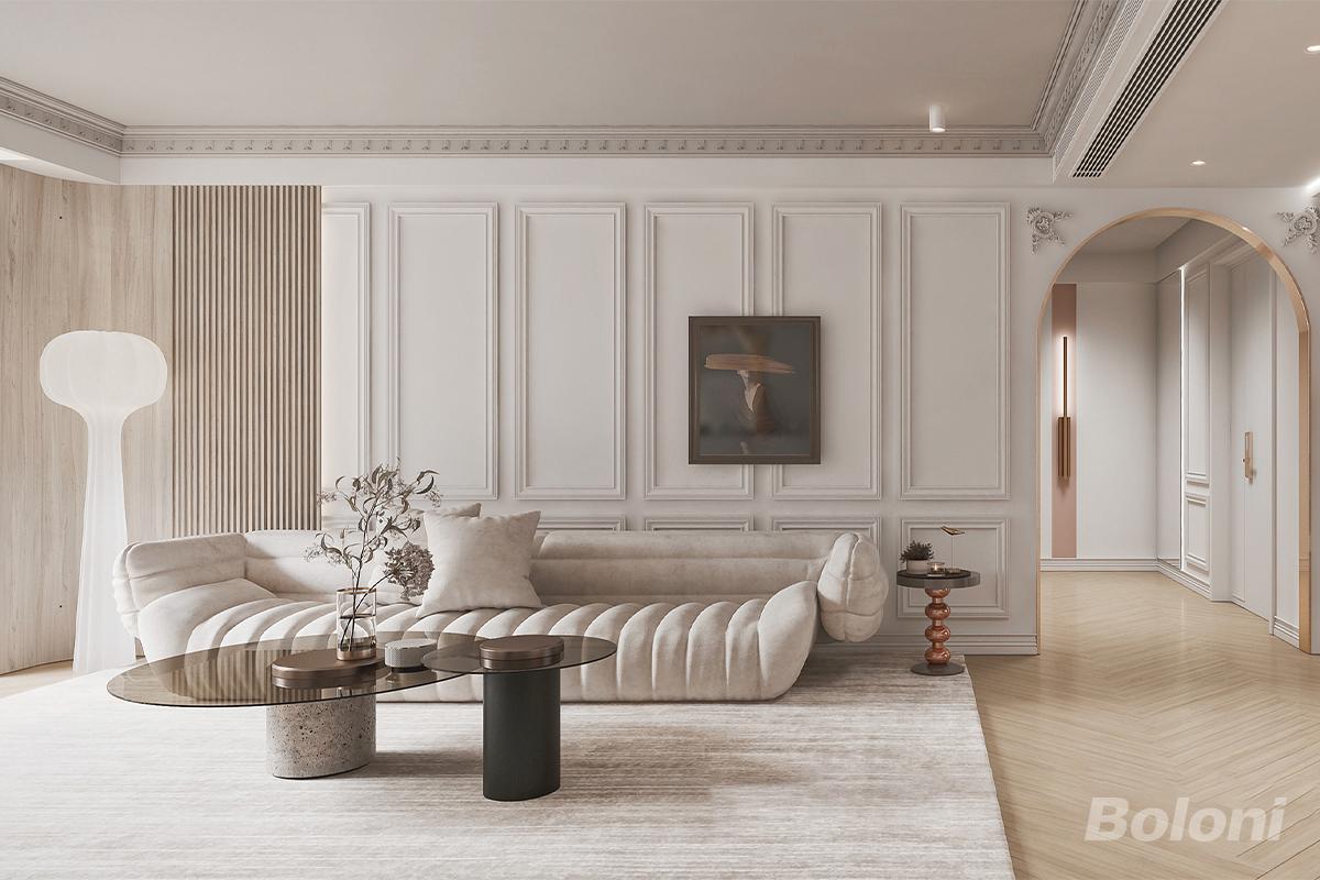 墙壁上的法式线条装饰,优雅流畅,展现出细腻的工艺。奶白色的沙发稳重而大气,搭配着白色的抱枕,简洁而不失时尚。地毯上的花纹精美细致,如同一件艺术品。茶几上的花瓶,插满了绿植,让整个空间充满了生机与活力。