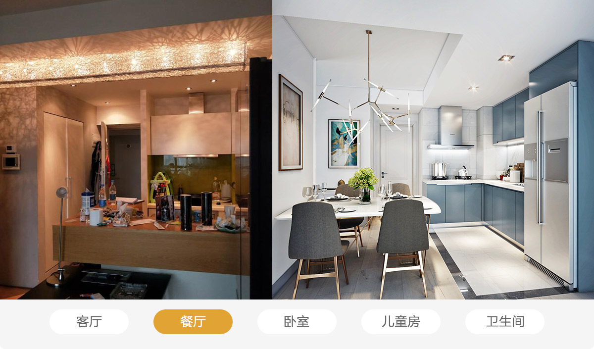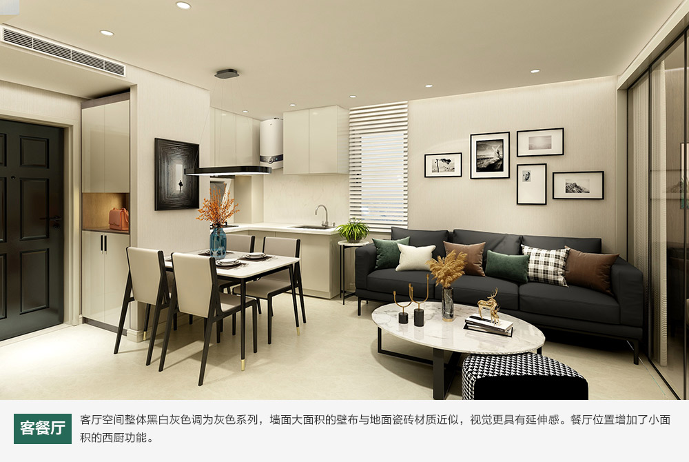 变开放式的厨房,厨房餐厅以及客厅的空间结合,让空间变得更大,借用厨房的窗户增加客餐厅采光和通风,变换餐桌形式,做成吧台式餐桌, 使橱柜操作空间和功能得到延伸。效果上实现了空间的延伸性。