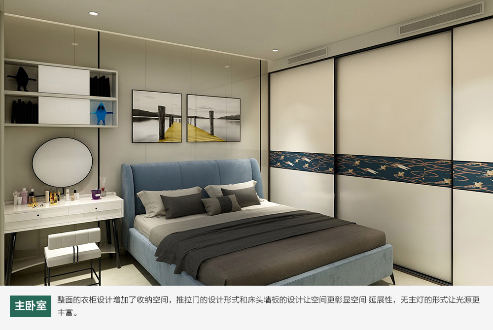 利用左右对称的形式设计了鞋帽区和挂衣区,并且把冰箱和洗衣机嵌入到门厅柜,节省的厨卫的空间,噪音远离卧室。